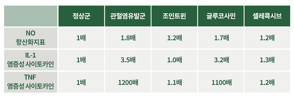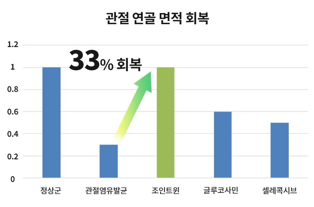 관절염 모델에서 조인트윈(WIN) 3주 섭취 후 33%회복되어 손상된 연골이 정상군으로 개선되었고, 글루코사민, 셀레콕시브 4주 섭취 후에도 정상군으로 회복되지 못함