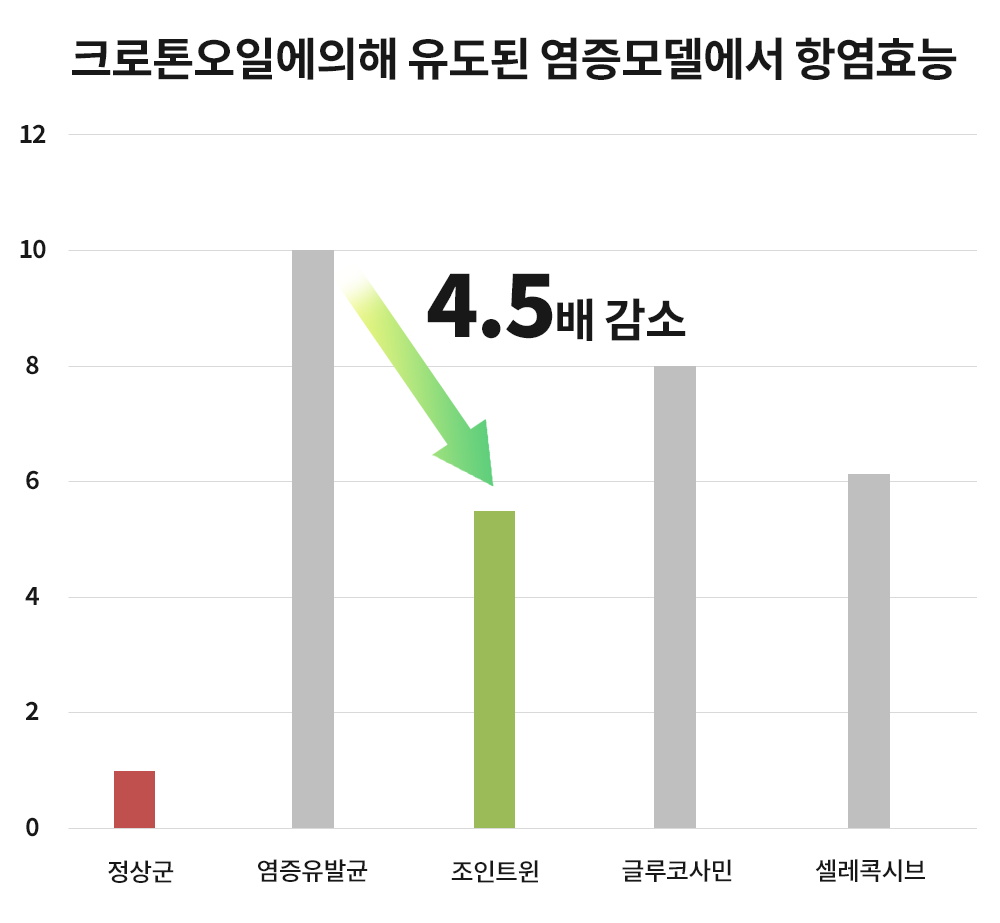 크로톤 오일에의해 유도된 염증모델에서 조인트윈(WIN) 섭취 후 글루코사민, 셀레콕시브 대비 가장 우수한 항염 효능을 보임