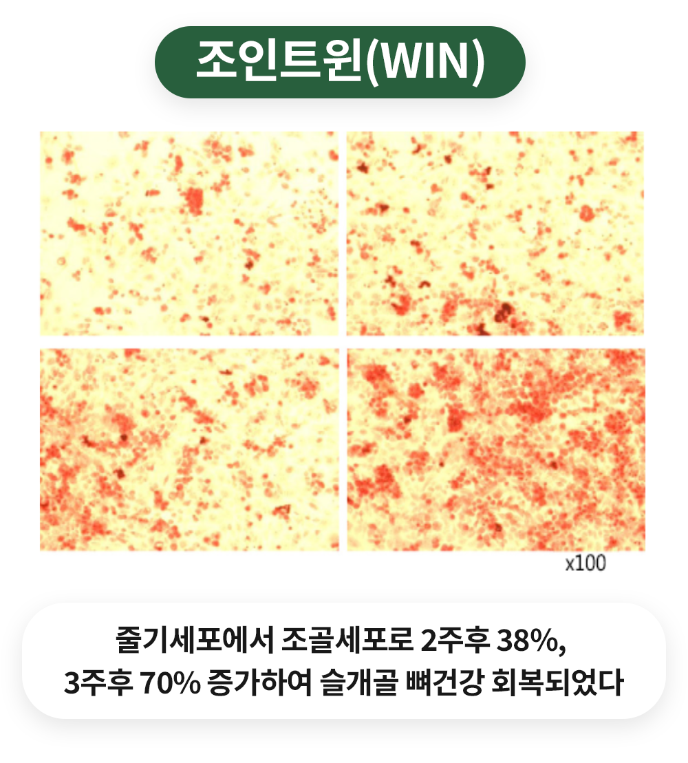 조인트윈(WIN)은 연골하골하부조직의 줄기세포가 2배에서 10배 증가, 연골조직 구성성분인 콜라겐과 어그리칸이 각각 1.5배 증가시킴.