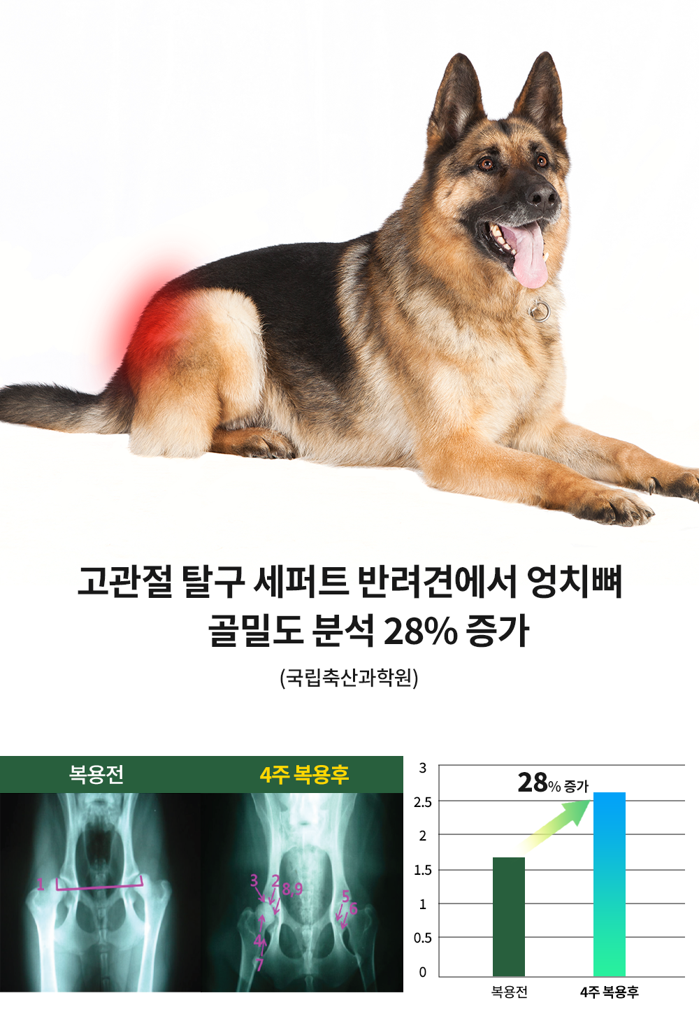 슬개골 탈구 반려견에서 4주 섭취 후슬개골 통증지수 52% 감소, 근육무게 10% 증가