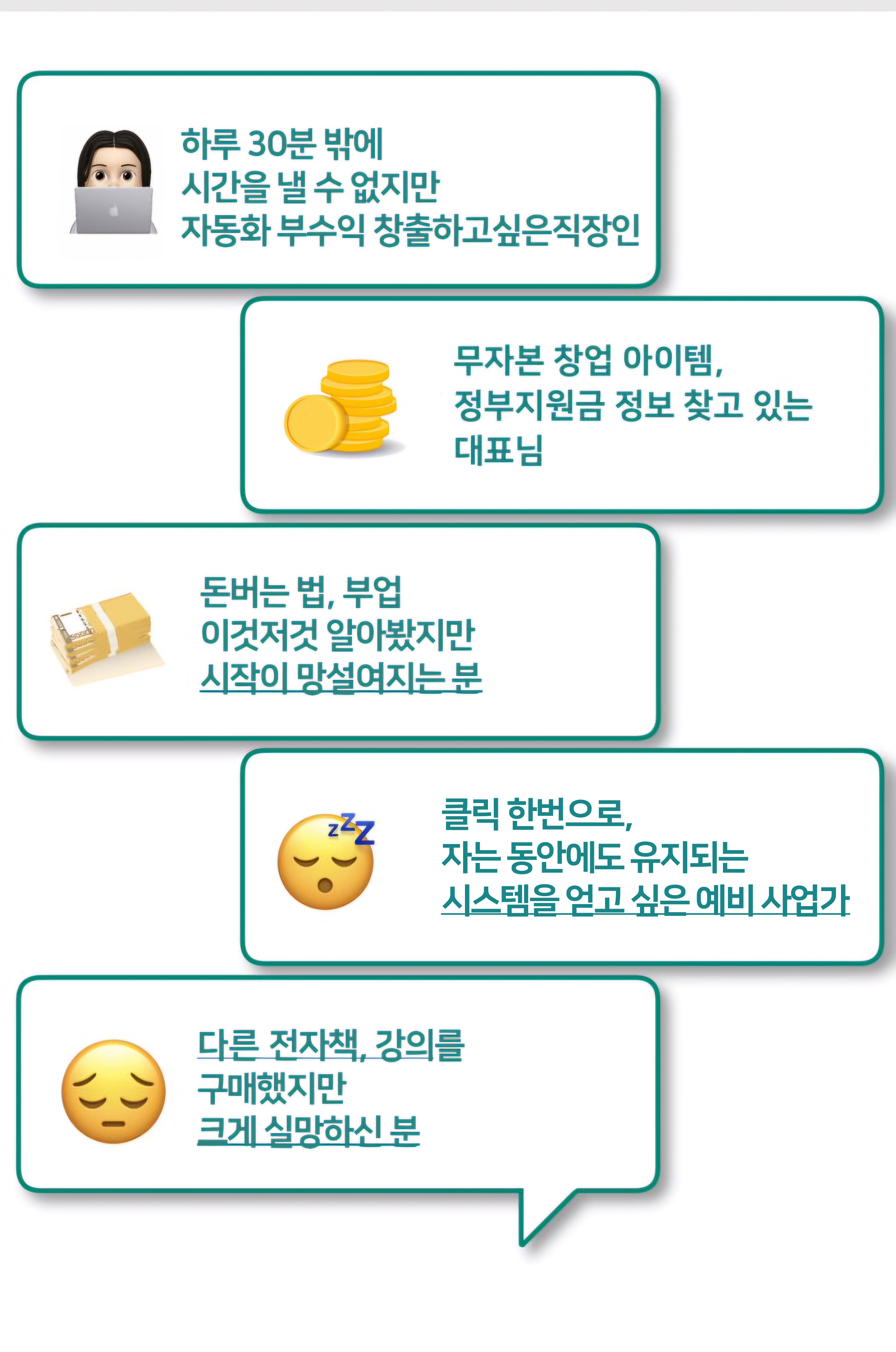 몇 년 전의 저와 같은 상황에 놓인 사람들을 돕고 싶은 마음에 이 프로젝트를 준비했습니다.