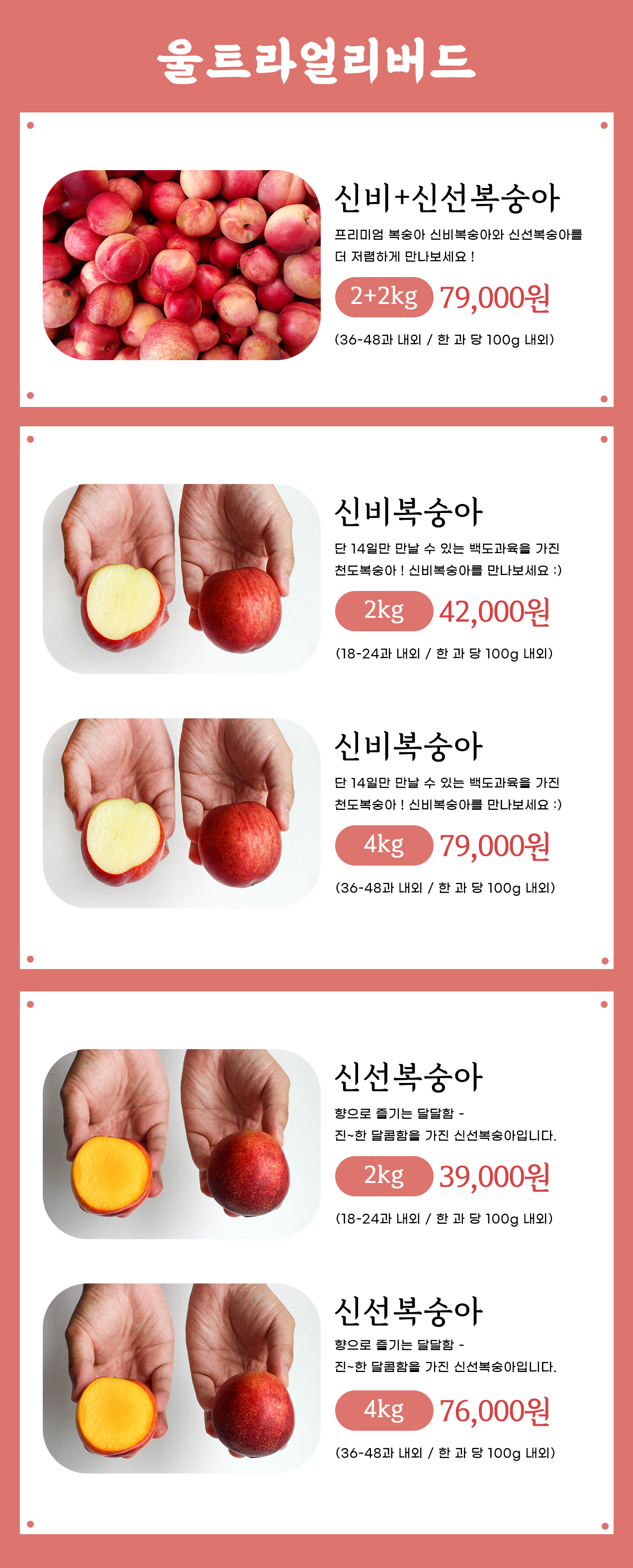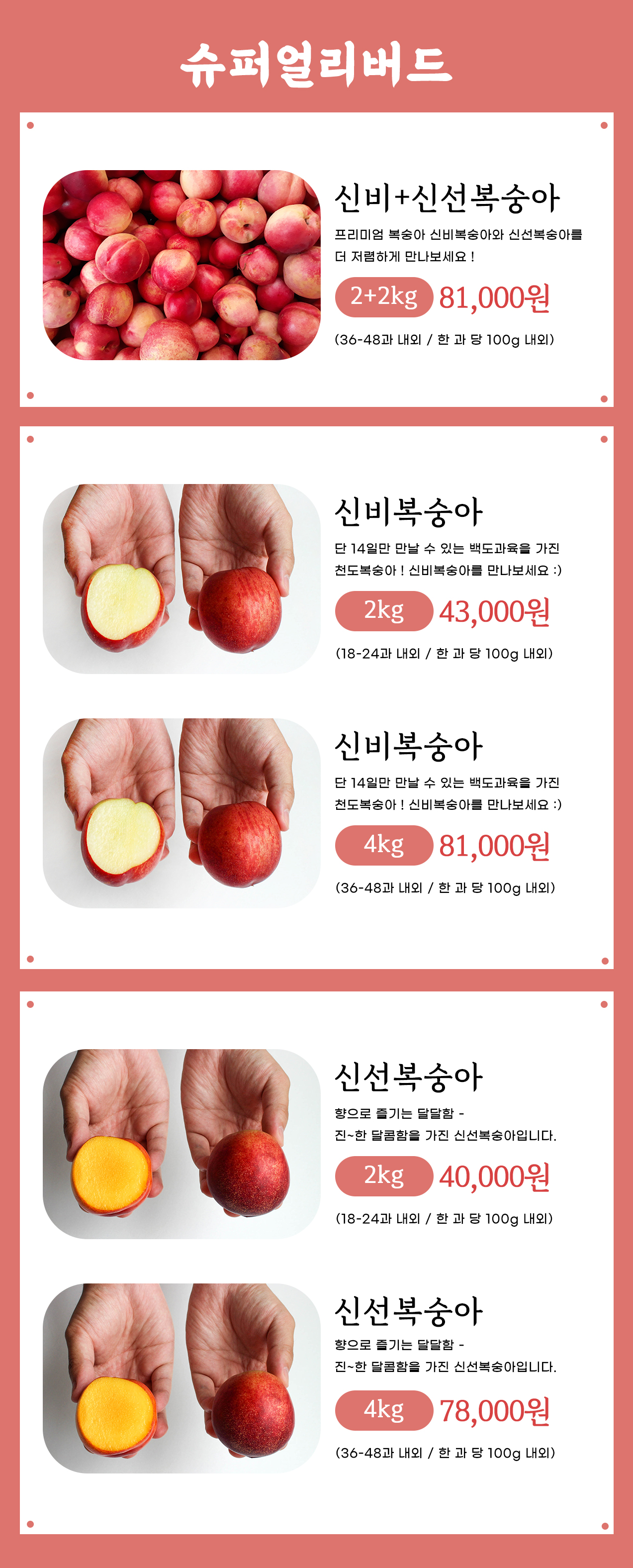 구성 : 신비복숭아 2kg, 4kg / 신선복숭아 2kg, 4kg / 신비+신선복숭아 2+2kg