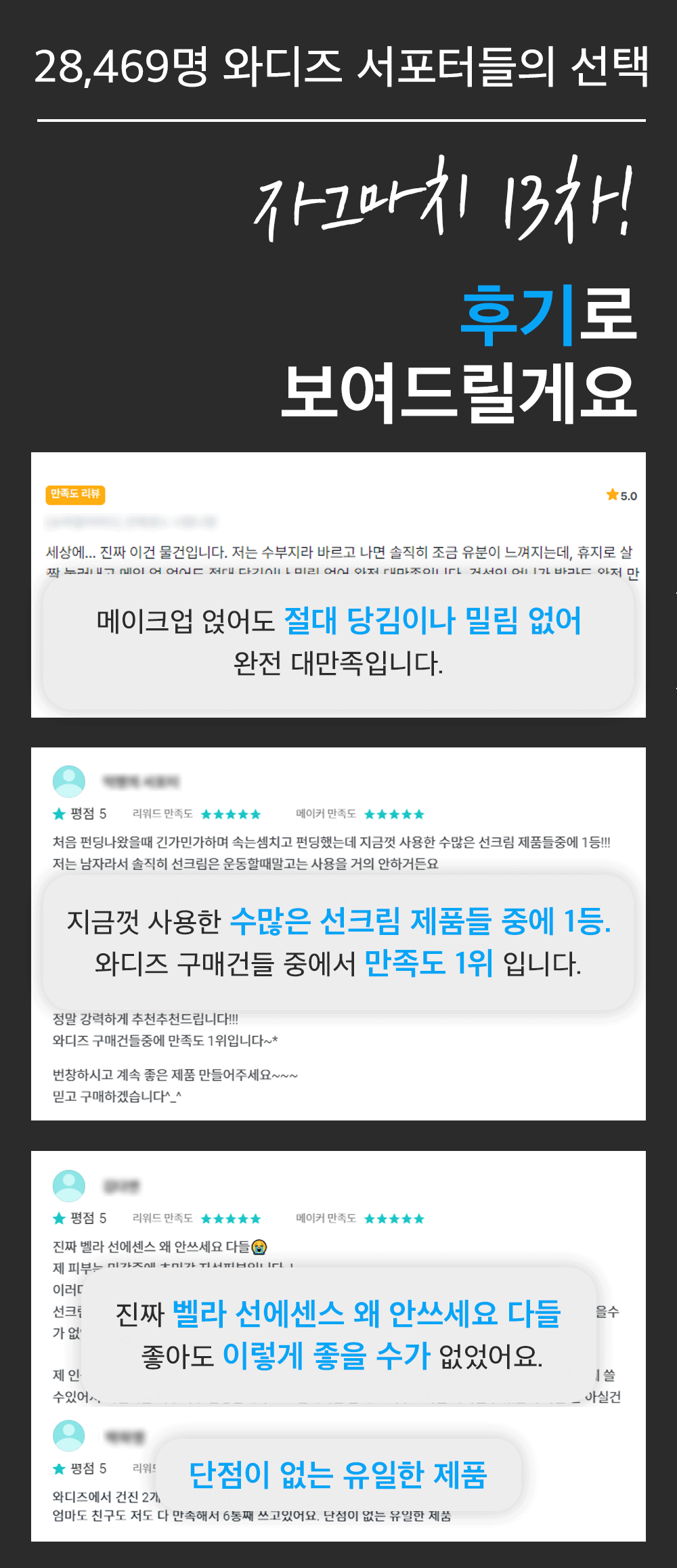 너무도 만족해주시고, 좋아해주시고, 응원해주셔서 감사 드리며, 벨라 선에센스를 사용하시면서 건강한 피부, 건강한 일상이 되시길 바라겠습니다. 벨라는 안주하지 않고, 지금도 계속해서 건강한 화장품을 만들고 있습니다. 서포터님들의 소중한 선택이 후회 없는 브랜드가 될 수 있도록 끊임없이 노력하겠습니다.
