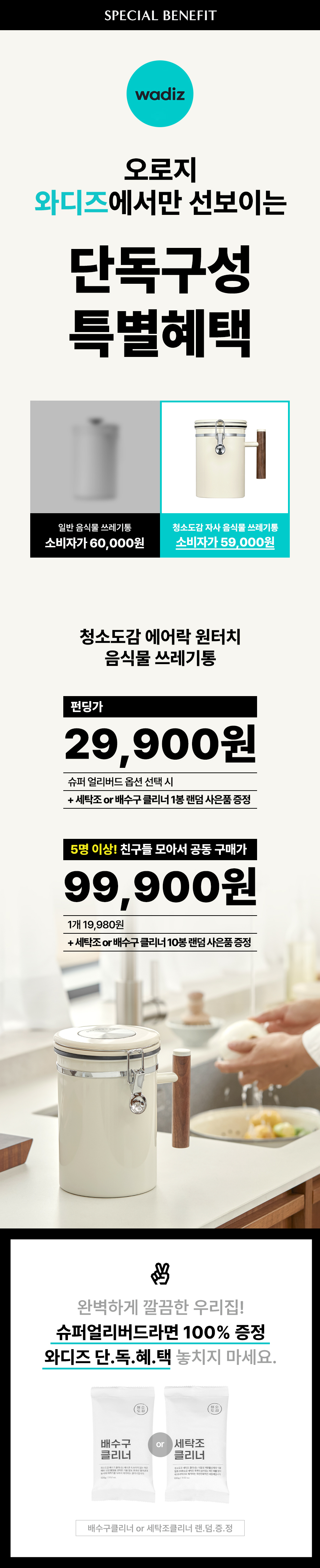 일상이 담겨있는 공간, 그 어디에도 내 취향이 묻어나지 않은 물건은 둘 수 없죠. 무엇 하나를 사더라도 세심한 고민을 하는 서포터님을 위한 디자인 입니다. 청소도감 음식물쓰레기통은 어디에 놓아도 인테리어와 어우러지는 클래식 디자인으로 자체 제작하였습니다.