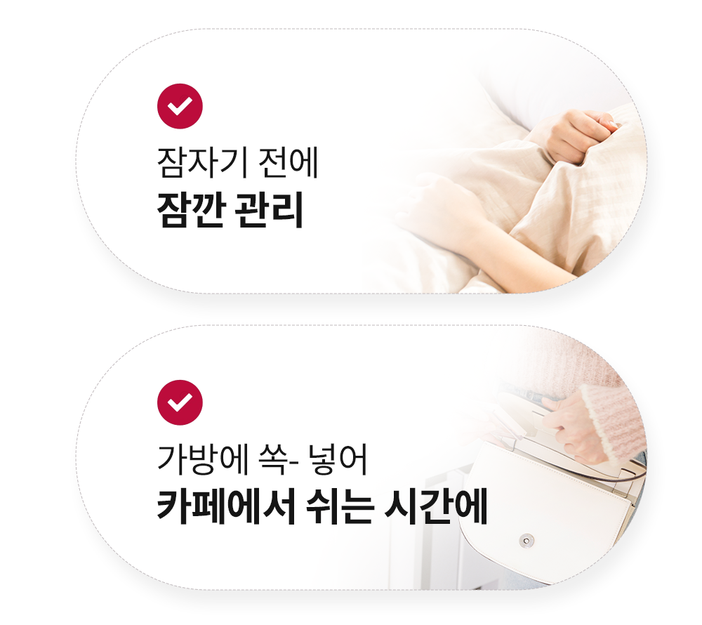 가방에 쏙- 들어가는 컴팩트한 크기로 언제 어디서나 꺼내서 손쉽게 사용할 수 있습니다. 대중교통을 타고 이동하는 과정에서도 카페에서 커피를 마시면서 쉬는 시간에도 가방에서 쏙- 꺼내 매일 매일 내 복부를 관리해 주세요.