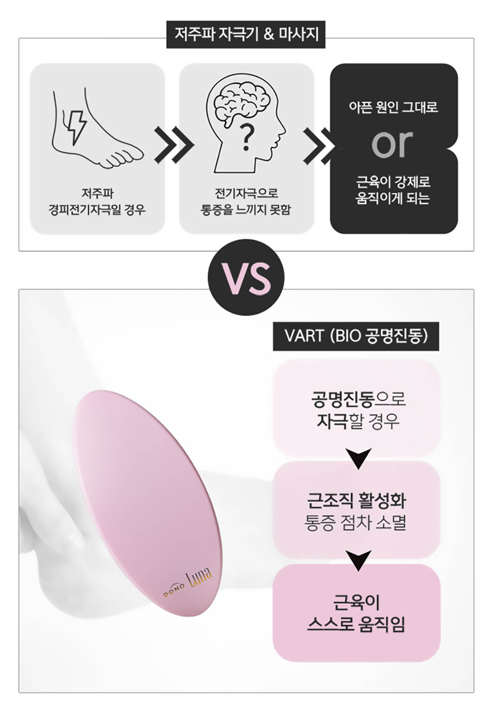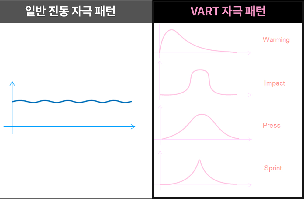 인체조직은 특정한 패턴을 가지고 불규칙적으로 움직입니다. 모든 세포와 크기가 다르기 때문이죠. 그래서 자극 방식이 일정하고 패턴이 없는 일반 진동 자극 방식은 일시적으로 나아지는 듯싶지만, 결국에는 간지럽게 만들고 효과까지도 떨어지게 만듭니다.