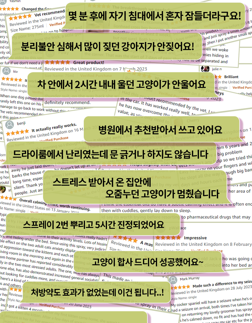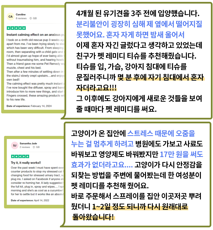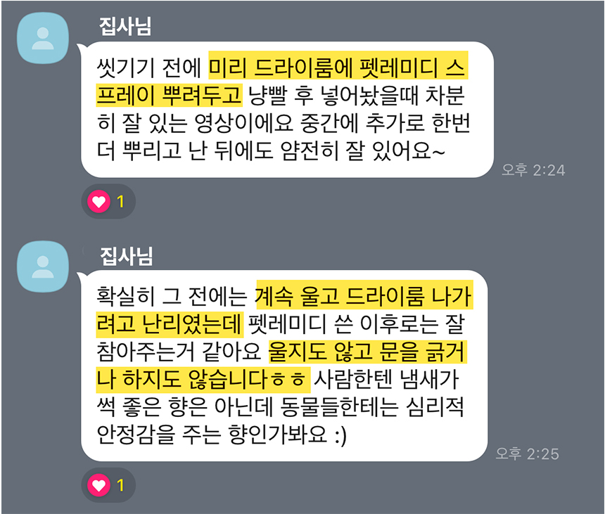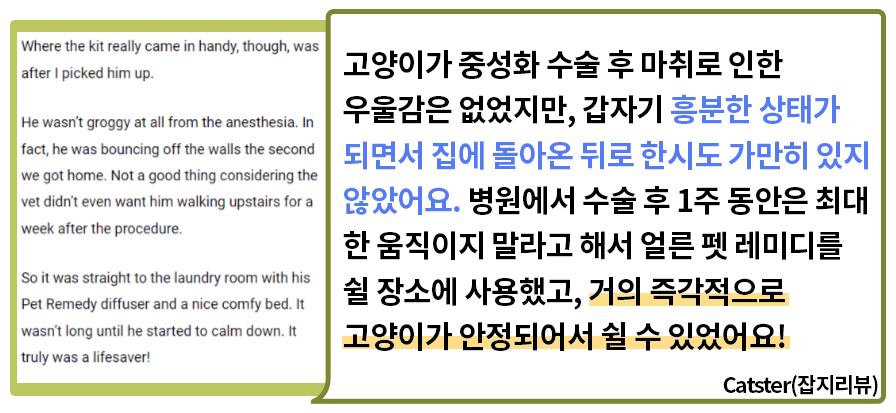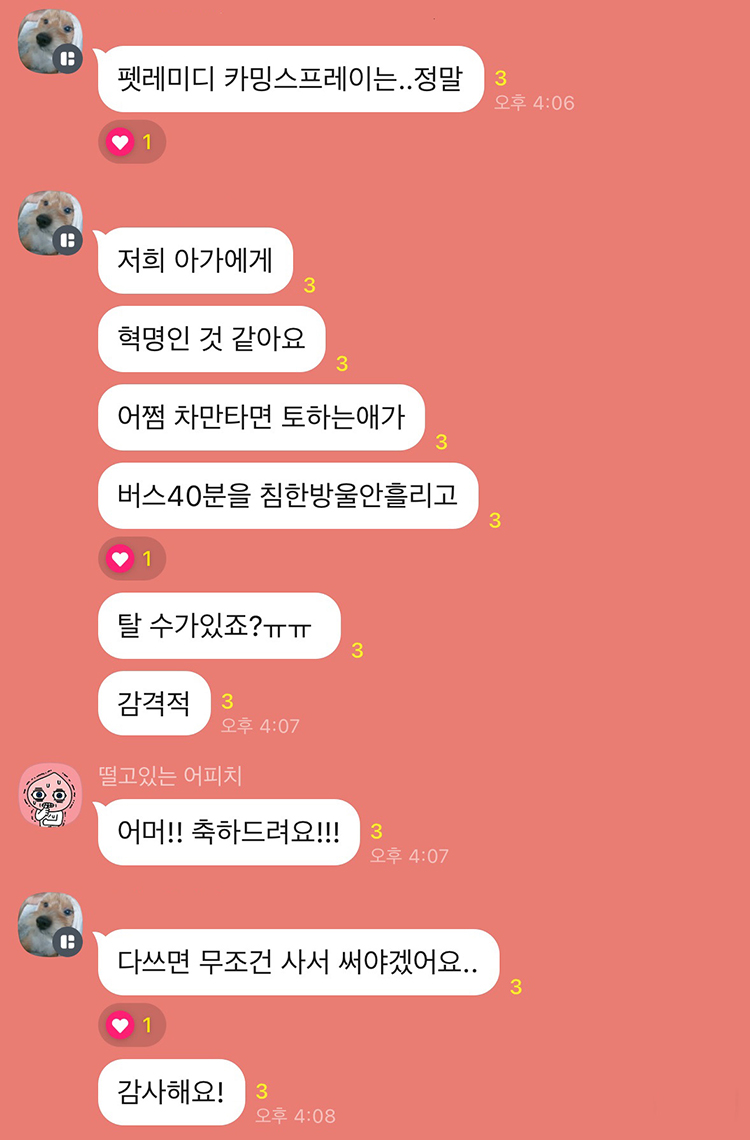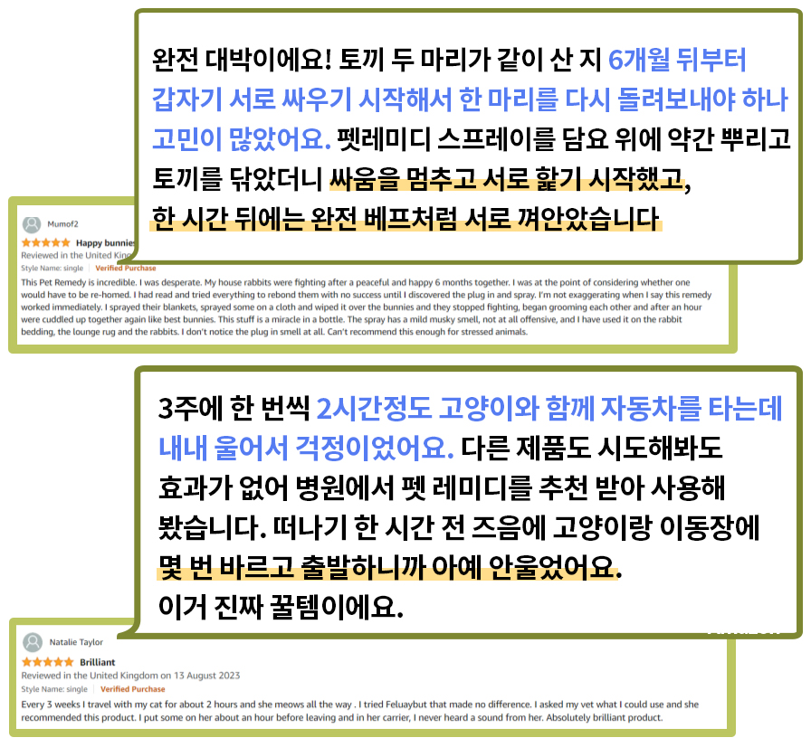 뿐만 아니라 현재 키우고 있는 두 고양이가 응급실에 갈 만큼 긴박했던 순간에 펫레미디를 사용하면서 큰 도움을 받았습니다. 이동장 트라우마로 인해 건강을 해치는 건 아닐지, 이동장에 넣을 수 없는 건 아닐 지 이렇게 고민이 많았던 제가 이제는 병원에 데려가고 차에 태우고 미용실에 데려가도 건강 걱정 하지 않게 되어서 정말 고마운 제품이기도 합니다.