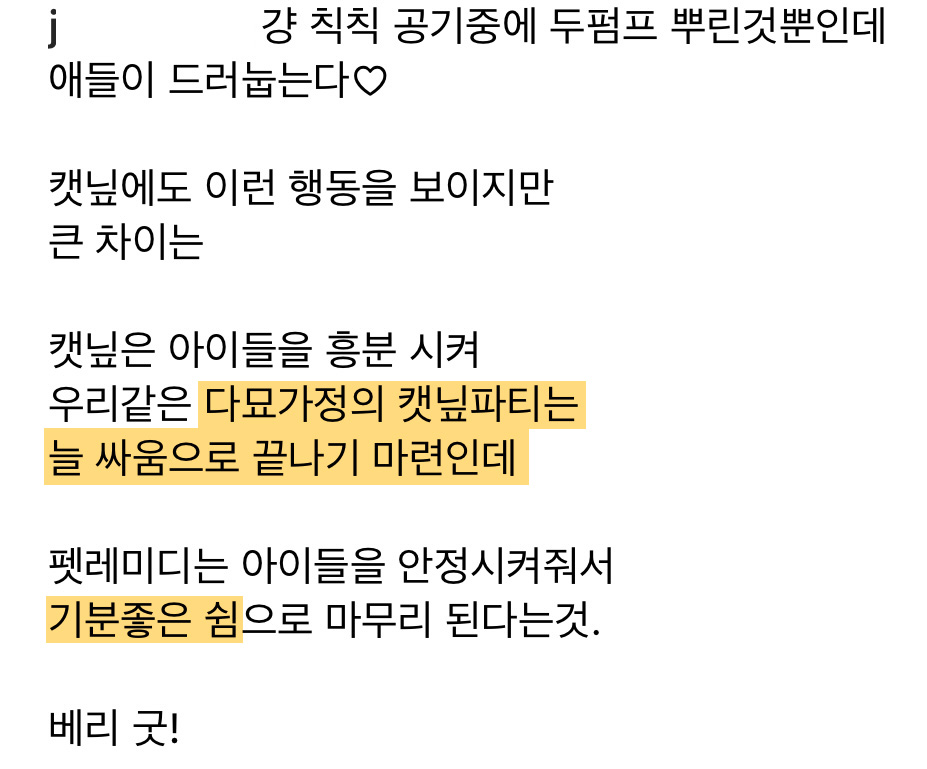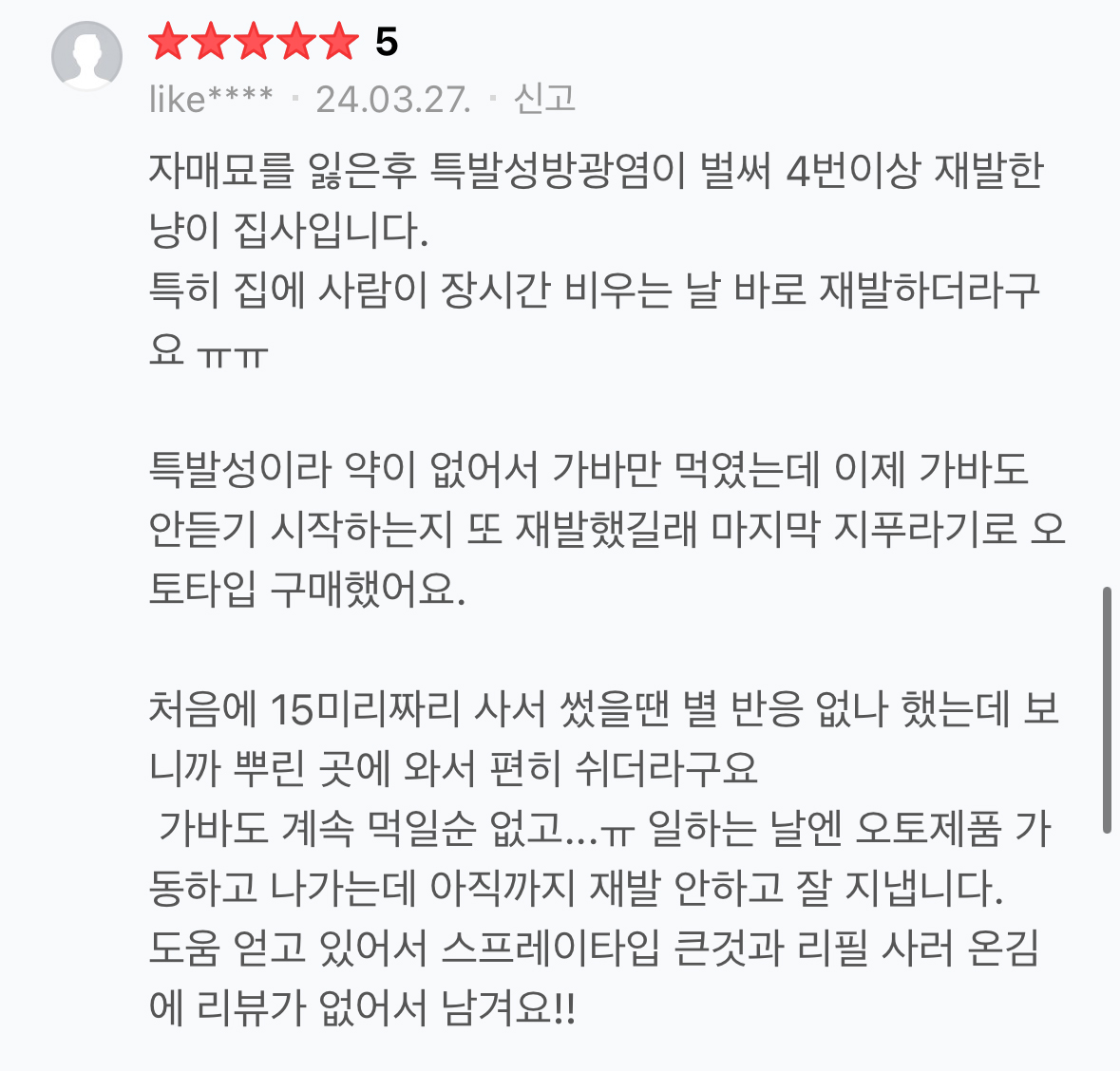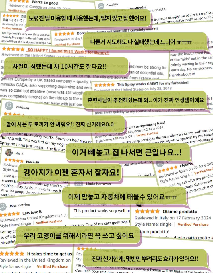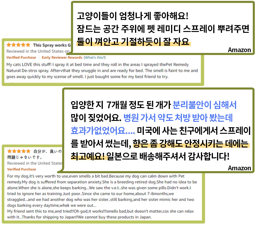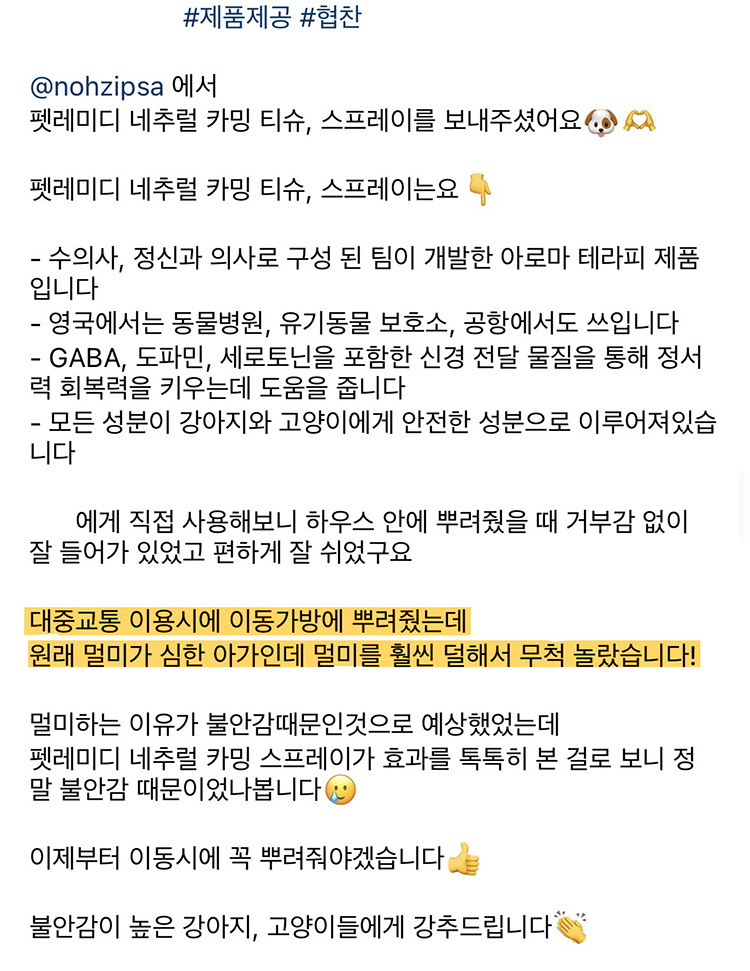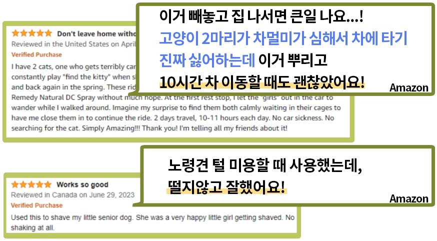 뿐만 아니라 현재 키우고 있는 두 고양이가 응급실에 갈 만큼 긴박했던 순간에 펫레미디를 사용하면서 큰 도움을 받았습니다. 이동장 트라우마로 인해 건강을 해치는 건 아닐지, 이동장에 넣을 수 없는 건 아닐 지 이렇게 고민이 많았던 제가 이제는 병원에 데려가고 차에 태우고 미용실에 데려가도 건강 걱정 하지 않게 되어서 정말 고마운 제품이기도 합니다.