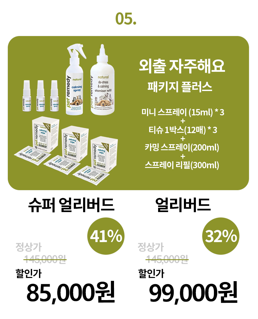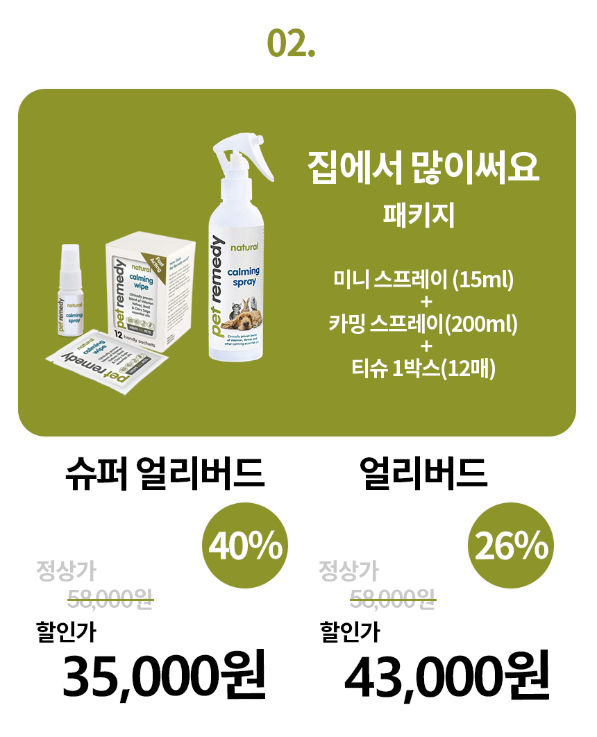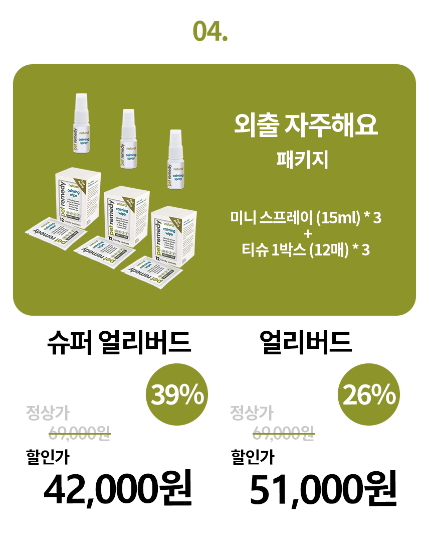 분리 불안은 훈련과 함께 지속적으로 사용하기를 추천 드립니다. 일정 시간 동안 계속 펫 레미디의 향을 맡을 수 있는 자동 분사기와 디퓨저가 있습니다. (디퓨저는 올해 하반기에 들어올 예정입니다.) 보호자께서 외출하시기 전에 카밍 티슈로 향을 바르고 반려 동물이 기다리거나 쉴 장소에 뿌려두면 좋습니다.