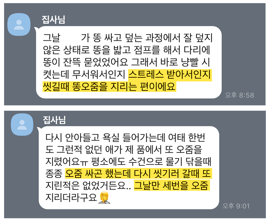 사료는 사람인 저도 먹을 수 있어야 한다고 생각해 직접 먹어 보기도 하고, 강아지 샴푸도 혹시 피부에 자극적이지 않는지 직접 머리도 감아보고, 고양이 모래도 화장실에 막히지 않는다면 막힐 때까지 마구 넣어보는 등, 제품이 어디까지 효과가 있는 지 직접 사용하고 테스트해보는 걸 좋아합니다.