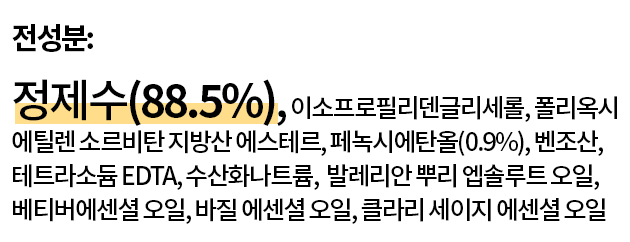 페녹시에탄올: 화장품에 많이 들어가는 성분 중 하나로 보존제 역할을 합니다. FDA에서 허가한 간접 식품 첨가제 및 한국, 일본 및 유럽의 제한 함량인 1%미만으로 함유되어 있습니다. 몸에서 대사 작용 후 배출되는 성분입니다.