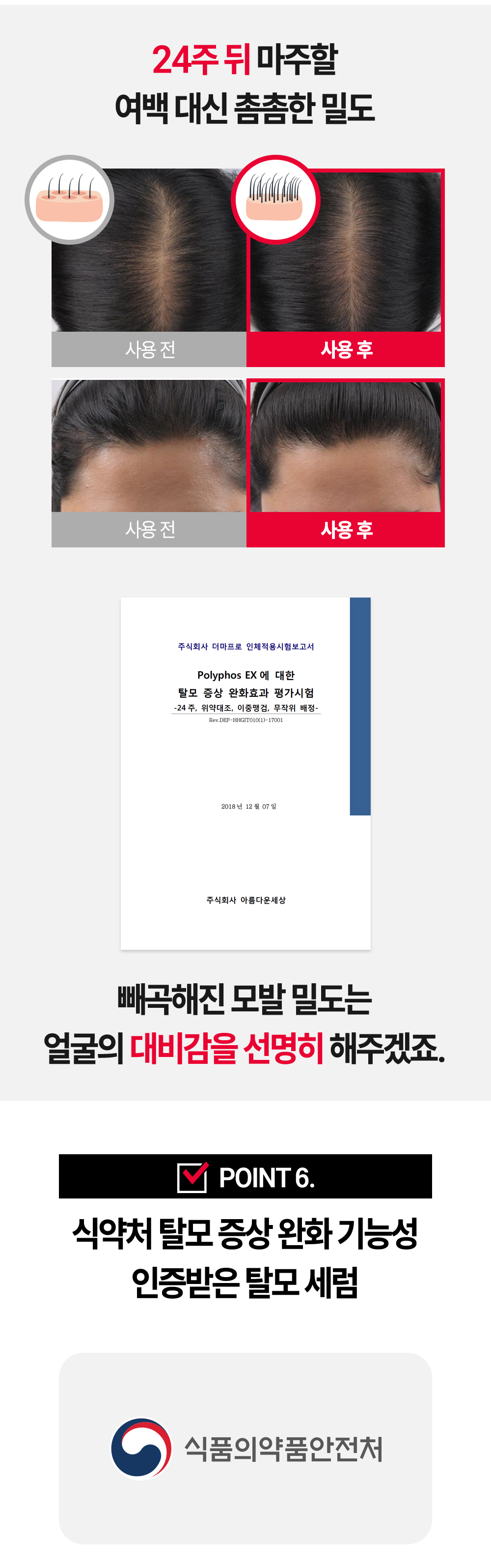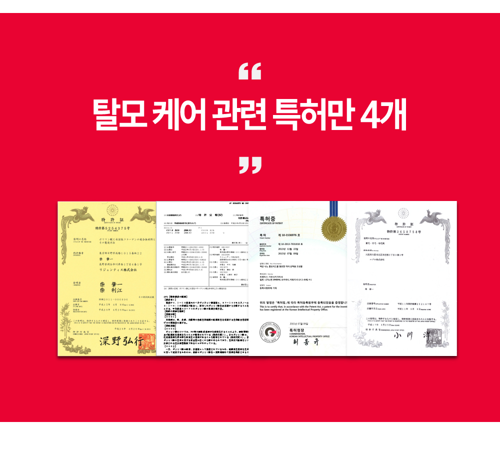 폴리포스 EX는 일본 탈모방지제 판매 1위 제품인 폴리퓨어 EX를 한층 더 업그레이드하여 한국에 런칭한 제품으로 그야말로 일본 대히트 상품입니다. 또한 헤어케어 분야 7년 연속 일본 라쿠텐 랭킹 1위 (각 분야에서 12관왕 획득), 세계적인 몬드 셀렉션 5년 연속 금상을 수상한 제품입니다.