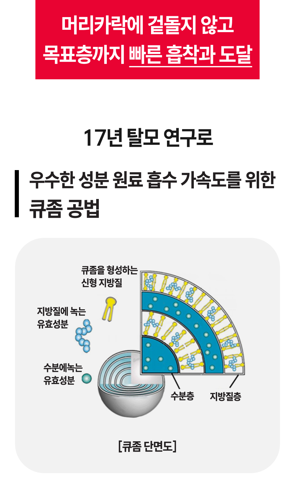 유효 성분 전달 기술인 큐좀 (QuSome) 공법을 통해 두피에 빈틈없이 흡수됩니다.