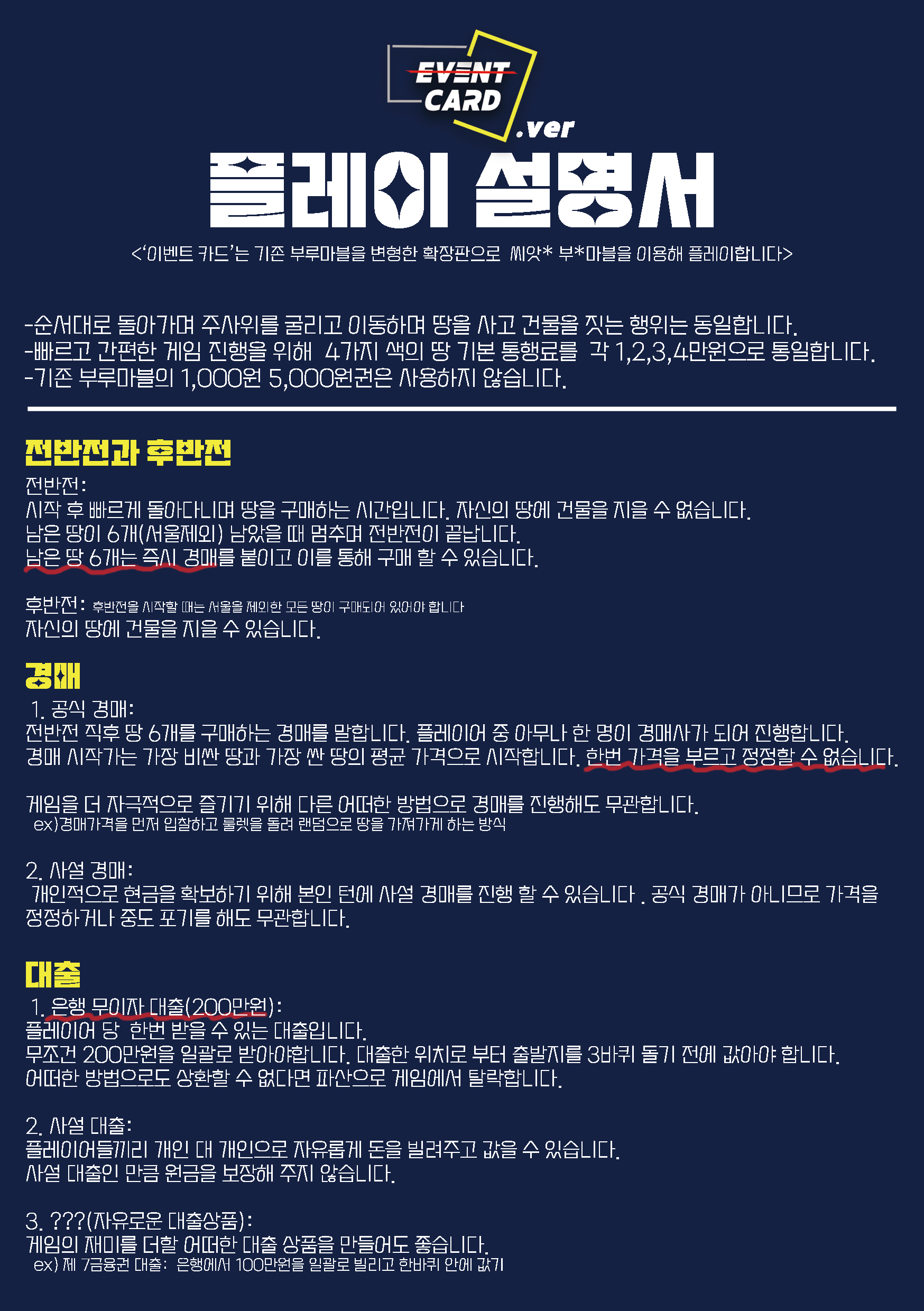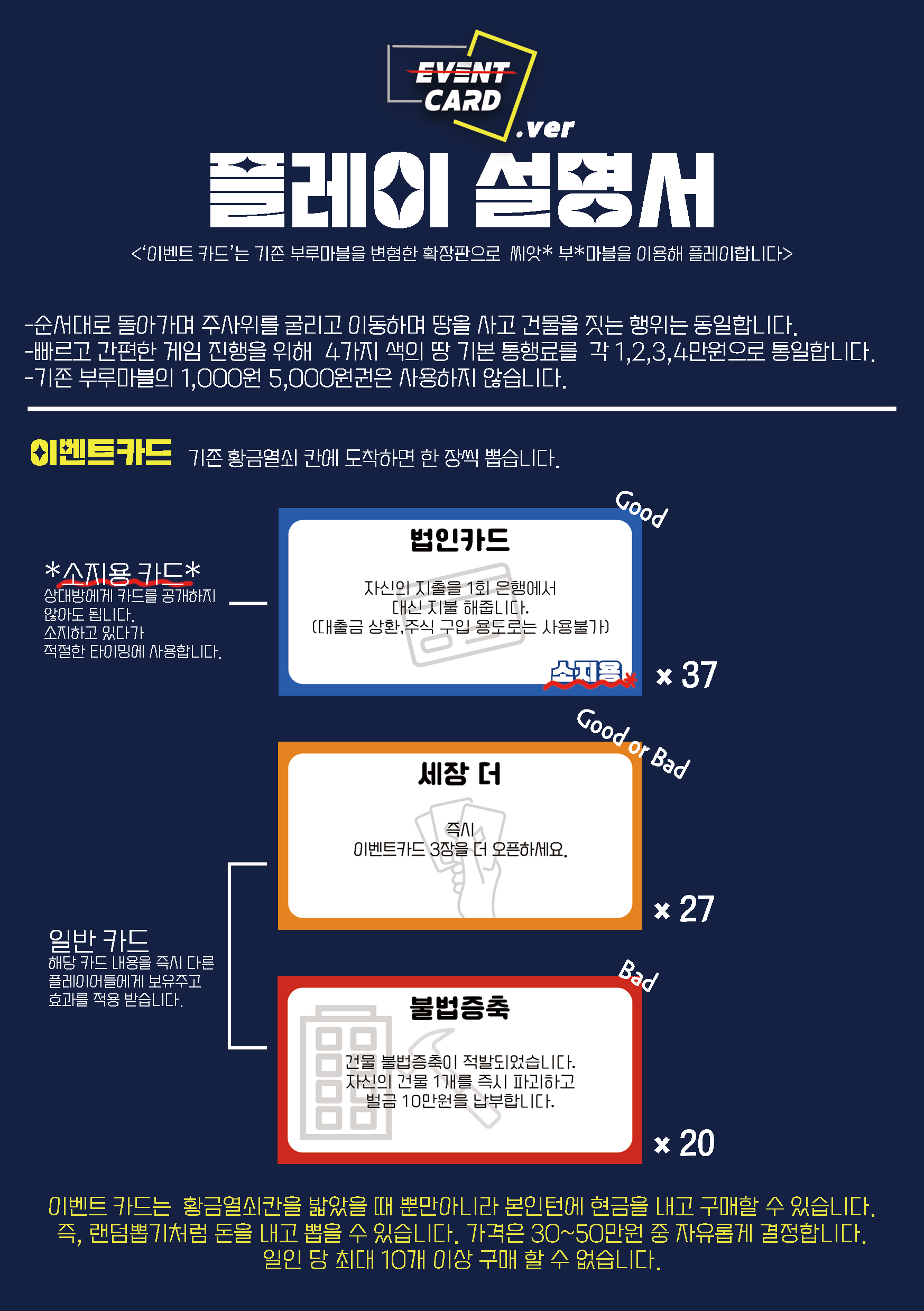 부루마블은 절대 수준이 낮고 단순하고 지루한 게임이 아닙니다. 무궁무진한 발전 가능성과 확장성을 가진 게임입니다. 게임의 잠재력과 플레이어들의 잠재력을 최대한으로 끌어내기 위해 <이벤트카드> 제작을 결심했습니다.