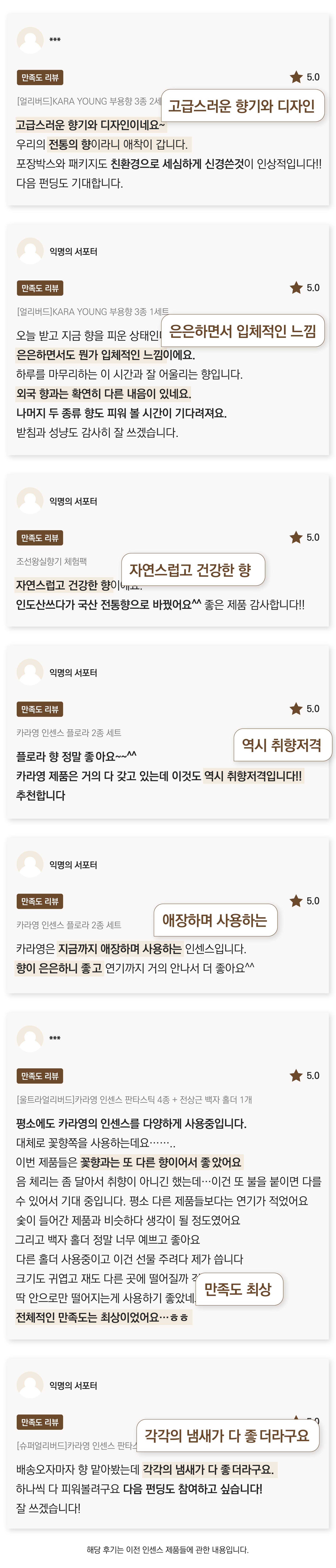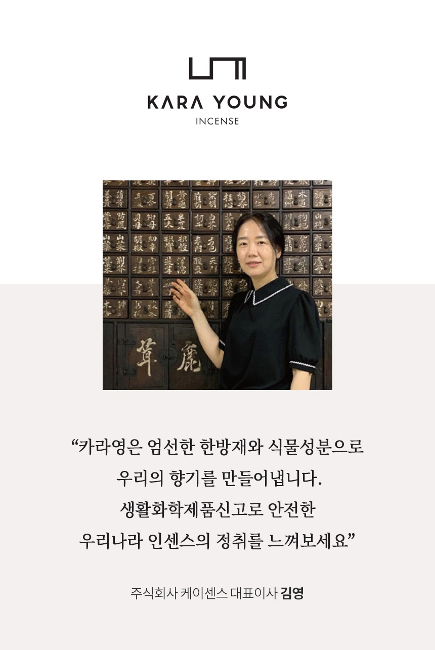 카라영 인센스는 잊혀져가는 우리 선향을 복원하고 현대화하기 위해 노력하고 있습니다. 믿고 향유하는 우리나라 인센스, 카라영에 많은 지지와 격려 부탁드립니다. 앞으로 신제품 출시를 위한 연구개발과 해외수출에도 더욱 힘쓰겠습니다.