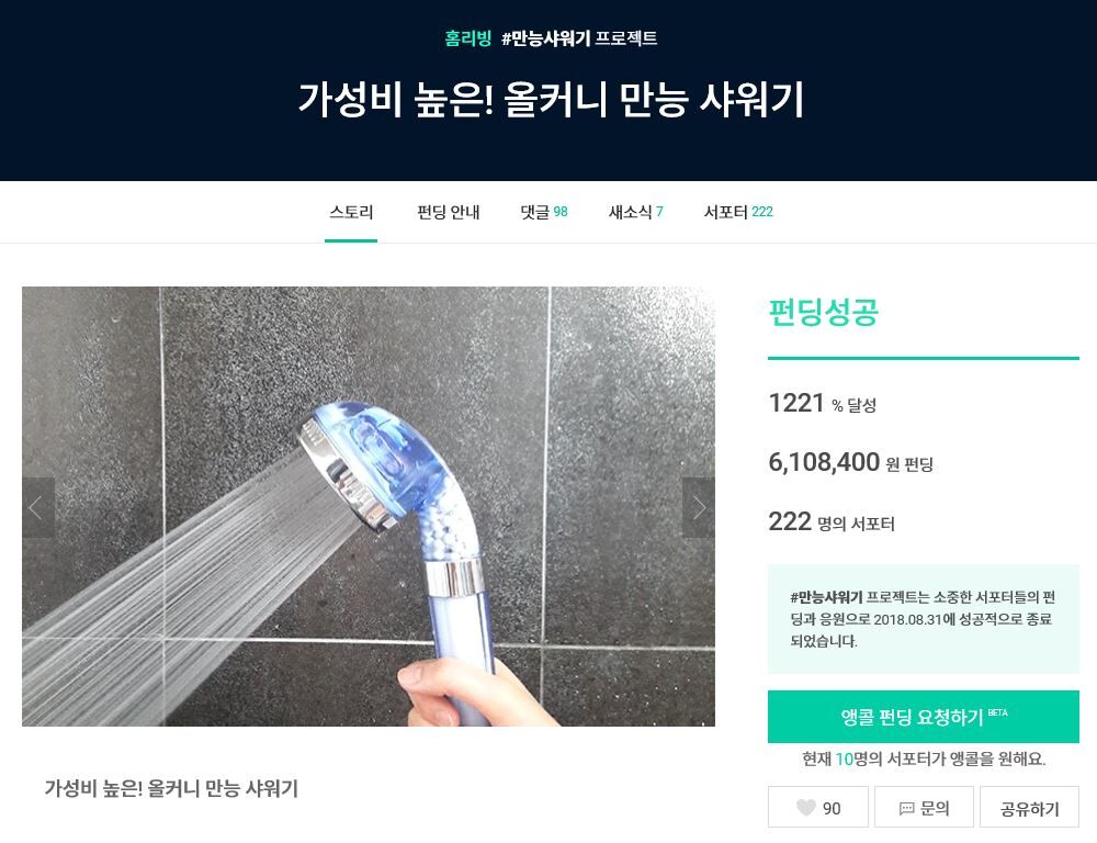 1차펀딩을 통해 1221% 목표 달성한 올커니 만능샤워기를 많은 분들의 성원에 힙입어 와디즈 리워드 앵콜펀딩을 통해 여러분께 다시 선보이게 되었습니다.