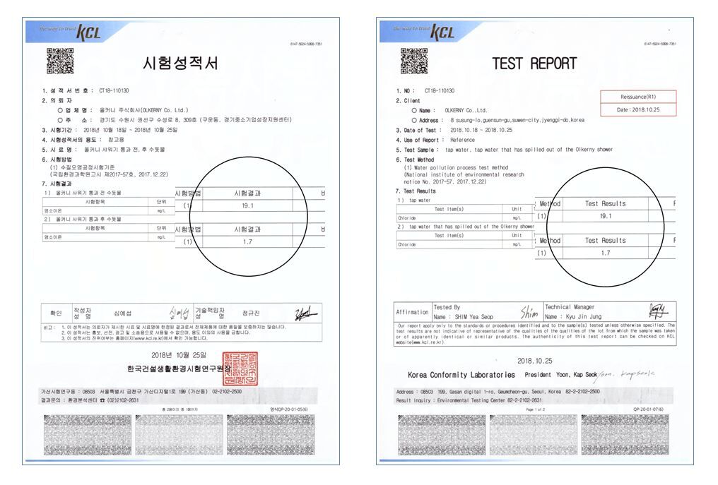 염소제거볼이 잔류염소 19.1mg/L을 1.7mg/L으로 낮추었습니다. (허용기준치 4mg/L)