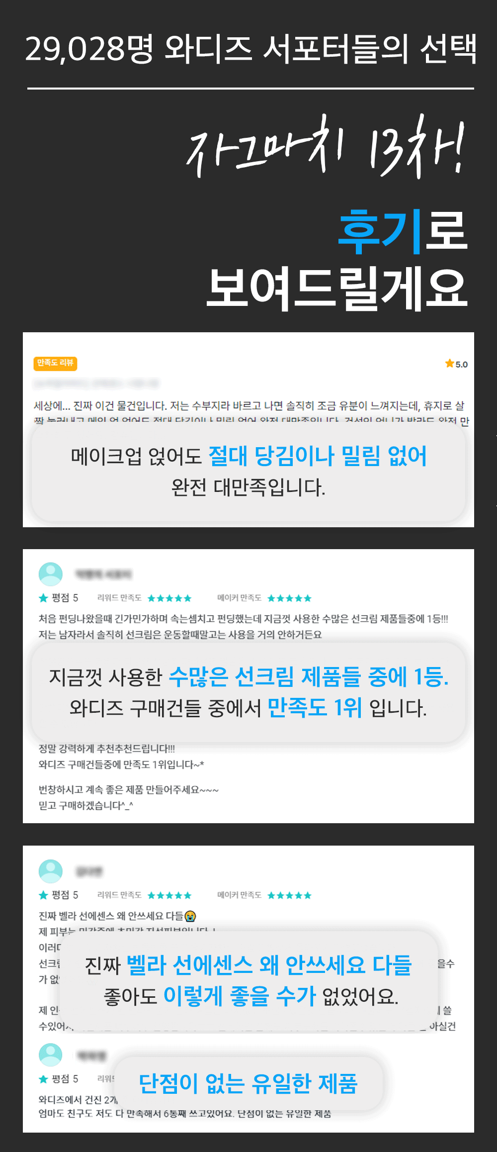 너무도 만족해주시고, 좋아해주시고, 응원해주셔서 감사 드리며, 벨라 선에센스를 사용하시면서 건강한 피부, 건강한 일상이 되시길 바라겠습니다. 벨라는 안주하지 않고, 지금도 계속해서 건강한 화장품을 만들고 있습니다. 서포터님들의 소중한 선택이 후회 없는 브랜드가 될 수 있도록 끊임없이 노력하겠습니다.