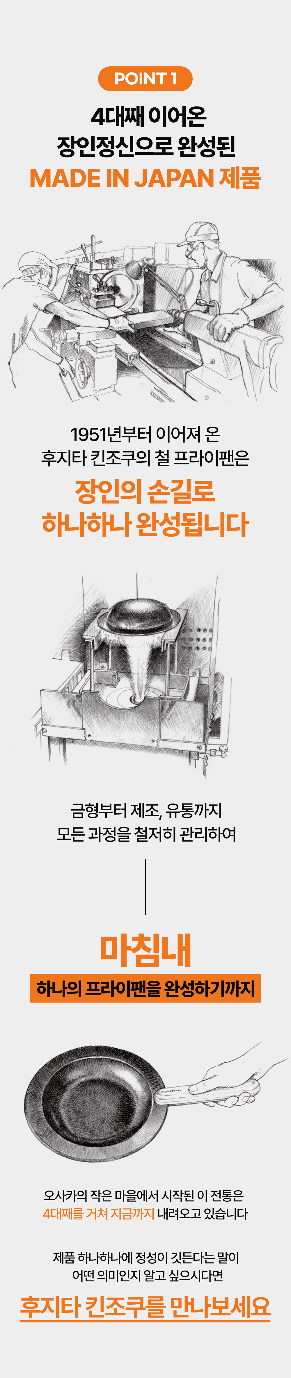 1951년, 오사카의 작은 마을에서 시작된 후지타 킨조쿠는 4대째 이어오는 장인 정신으로 제품을 만들어왔습니다. 철을 다루는 깊은 노하우와 섬세한 손길로 완성된 후라이팬은 단순한 주방 도구가 아닌, 여러분의 식탁을 더욱 특별하게 만들어줄 파트너입니다.