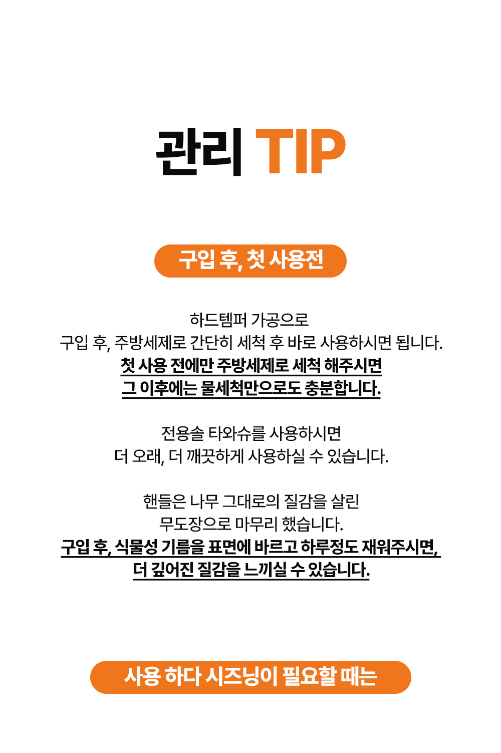 별도의 코팅이나 화학 처리가 없어, 세제 없이 물과 전용 솔로 간단하게 세척이 가능합니다. 보다 구체적인 사용법은 제품과 함께 동봉되는 설명서를 참고해주세요.