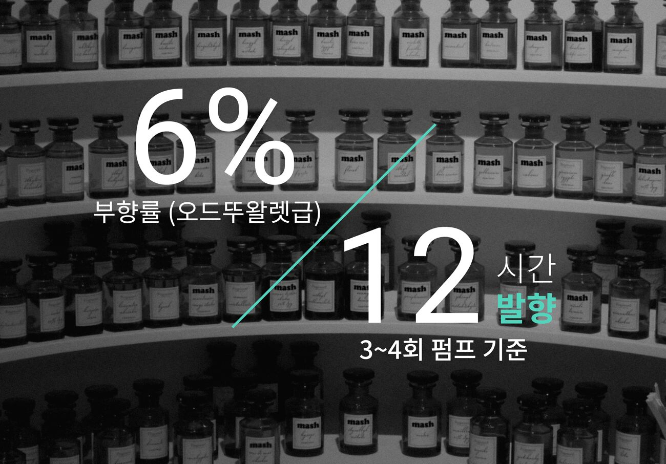 기존의 섬유향수들이 1%에도 못미치는 부향률이였다면, 매쉬 수트퍼퓸은 5-6%의 부향률(향수 원액 비율)을 자랑합니다. 한번 사용 시, 유지 상황에 따라 12시간 이상의 향을 유지할 수 있습니다.