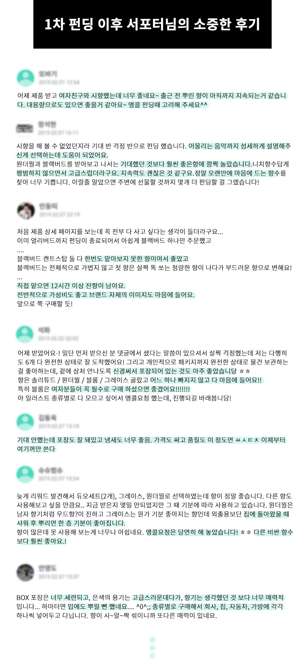 A. 강남역 10번출구 29CM STORE에서 오리지널라인 3종을 시향해 보실 수 있습니다. 하지만 이번에 와디즈로 공개되는 향기들(블랙버드,블룸,그레이스,원더월,솔리튜드)은 오직 와디즈에;서 최초 공개인 관계로 선시향이 어렵습니다. 대신 상상해보고 맡아보는 재미를 누릴 수 있답니다! :)