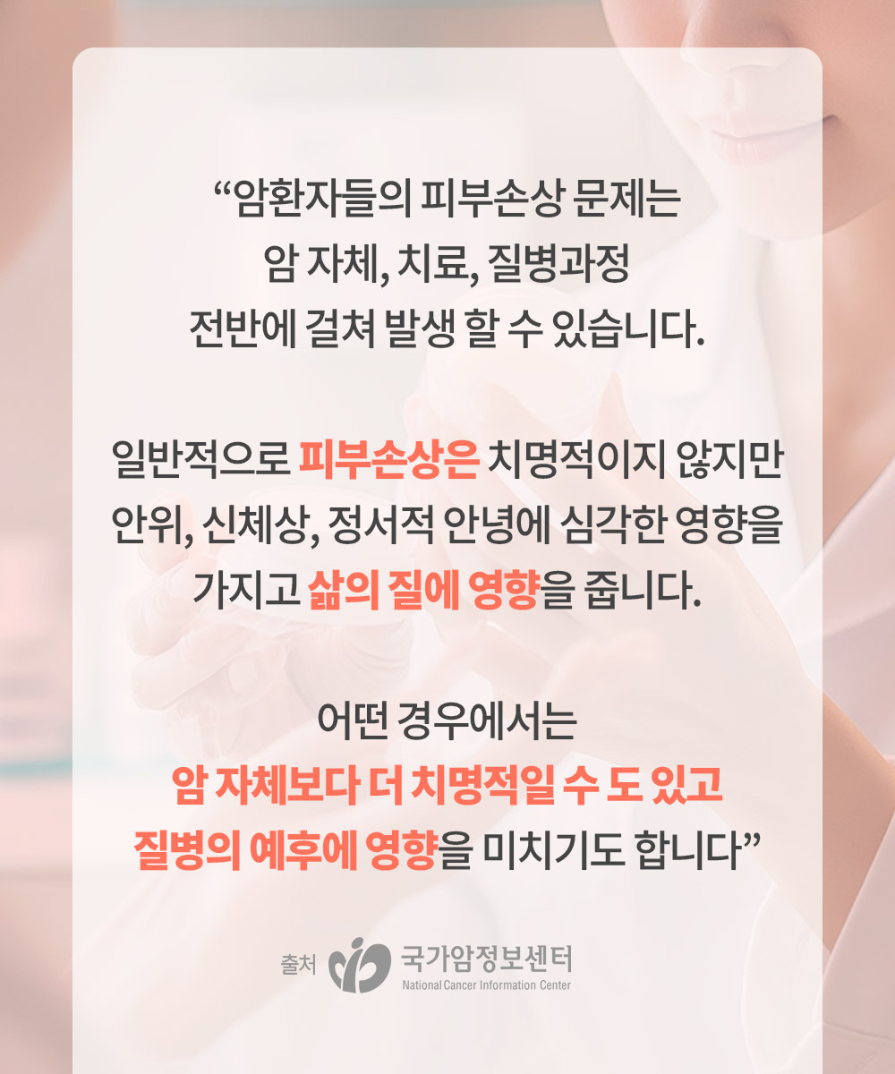 암은 아직도 여전히 힘든 질환이지만, 치료 과정을 잘 통과하고 오히려 "더 건강한 삶"을 누리시는 경우도 많습니다. 그러나 치료에 집중해야 하는 환자분들은 자신의 피부 문제를 돌아볼 여유가 없습니다. 주변에서 걱정할까봐 말하지 않고 참고만 계시는 경우도 많구요. 보호자들이 환자를 걱정하는 것처럼 환자분들은 가족과 지인을 걱정합니다. 헤아려주고 배려하는게 사랑이라고 생각합니다.