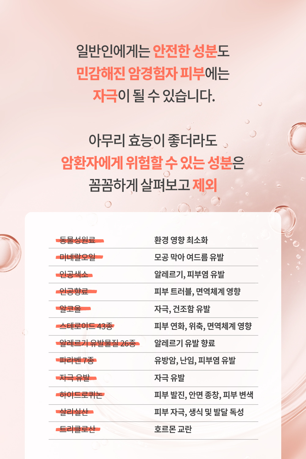 K-beauty가 글로벌 트렌드라고 하지만 화장품 책임판매업체가 3만개 넘는 상황에서 “나까지 브랜드를 낼 필요가 있나”라는 생각이었습니다. 그러다 알게 된 암경험자들의 피부 문제. 80%에 이르는 생존율이지만 생사의 기로에서 피부까지 신경 쓸 겨를이 없다는 것도 알게 됐습니다. 암으로 연약해진 몸과 마음을 보듬을 수 있는 선물을 드리고 싶었습니다.