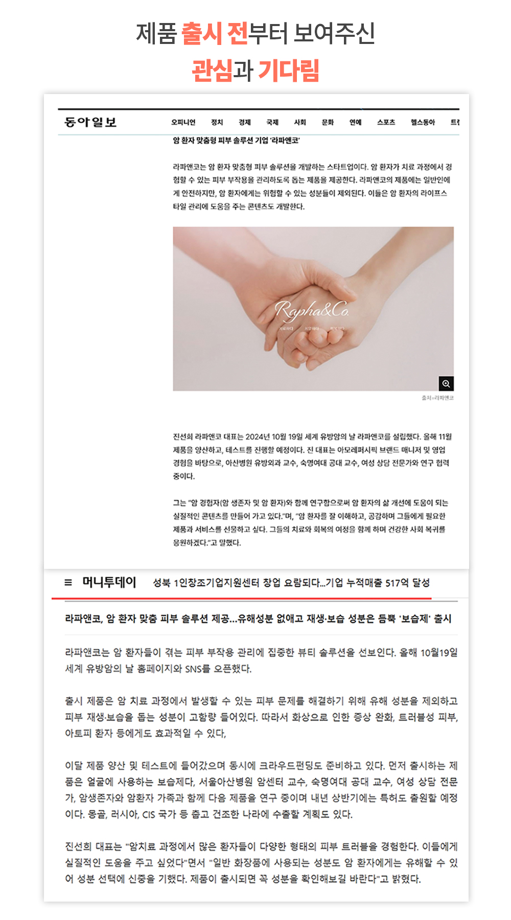 더 안심하고 사용하실 수 있도록 제품의 안전성, 유효성 임상을 진행하려고 합니다. 암경험자 삶의 질 개선, 피부 문제 고민에 도움을 드릴 수 있는 신제품 개발에도 속도를 더하겠습니다. 많은 관심과 응원 부탁드립니다. 암 경험자 삶의 질 개선을 위해 더 연구하겠습니다.