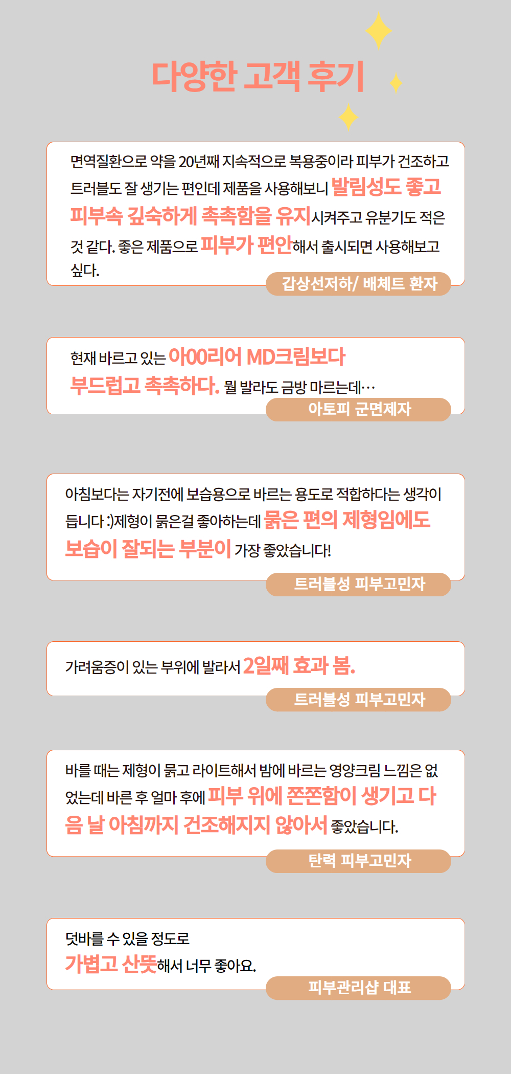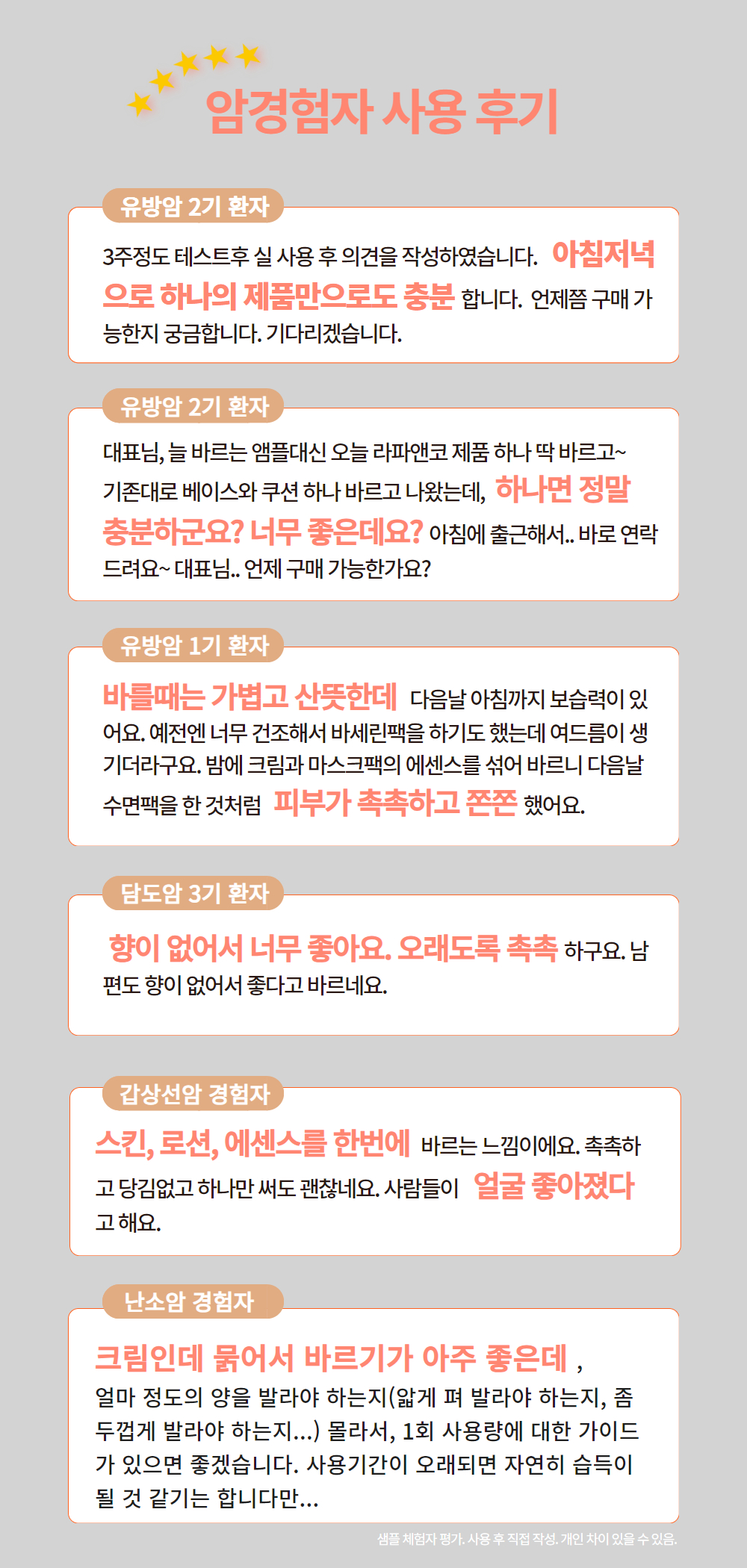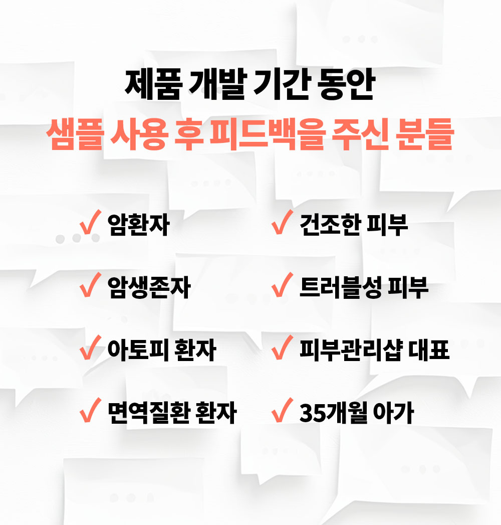 이후 암환자의 치료 과정과 피부를 연구하고 암경험자(환자, 생존자) 분들의 피드백을 지속적으로 받으며 함께 제품을 개발했습니다. 엄마, 해외 체류 시절 룸메이트, 20년 지기 친구 등 아주 가까운 분들도 계셨습니다.