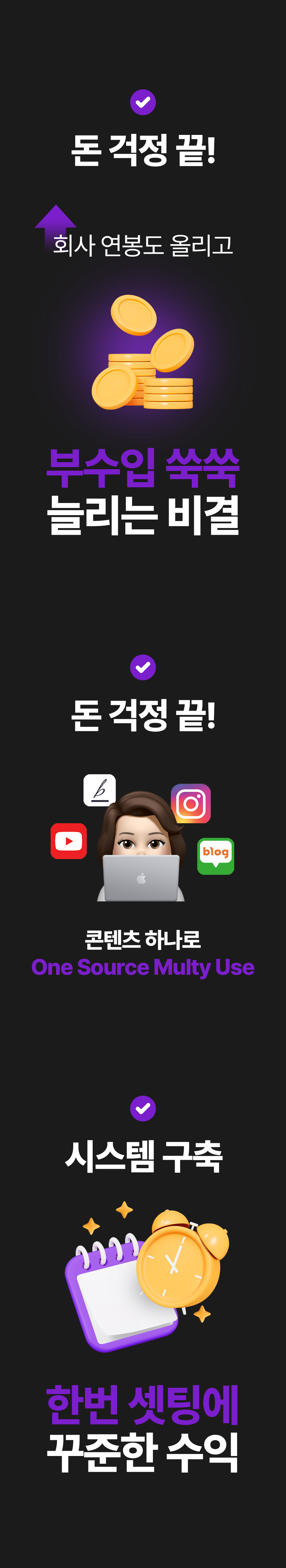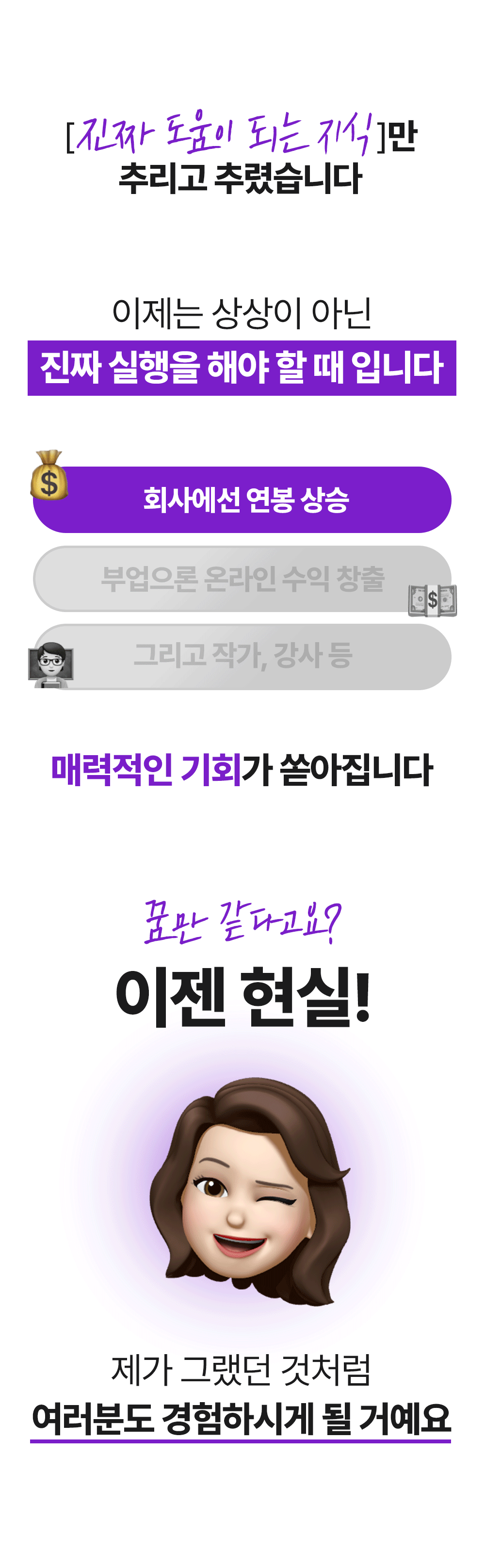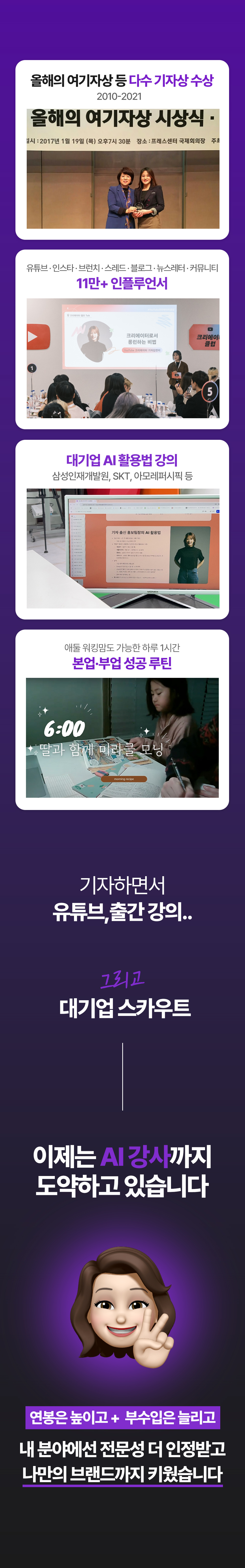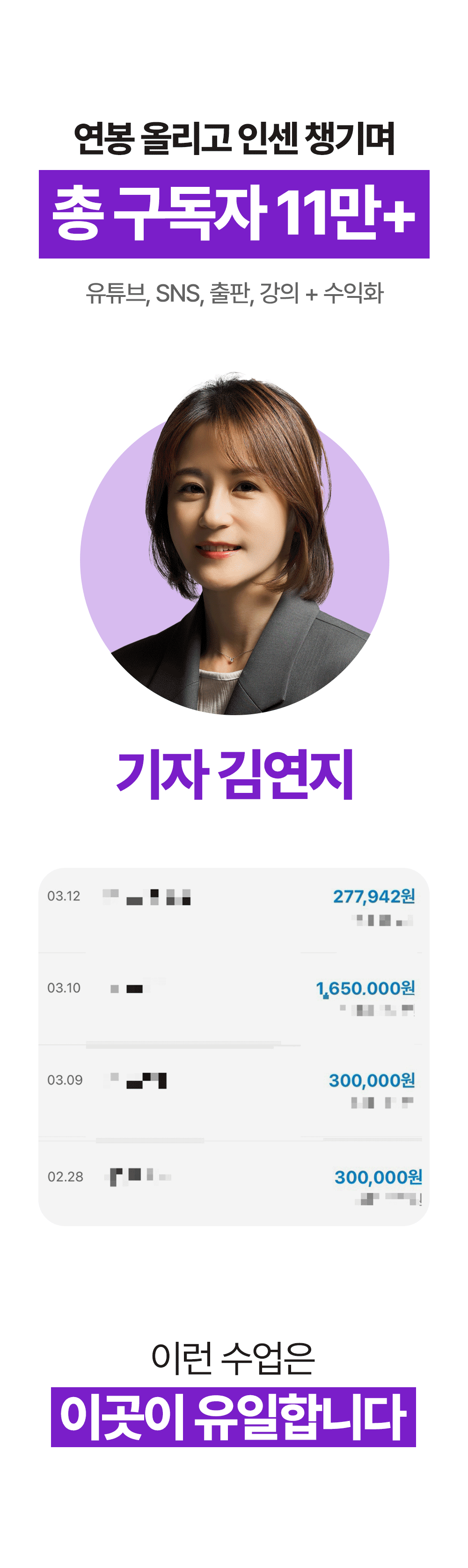 수많은 시행착오와 꾸준히 쌓아올린 시간이 지금의 저를 증명합니다. 커리어를 쌓으면서도, 제 스토리를 콘텐츠로 만든 것이 누군가의 길이 됐습니다. 저를 찾는 사람들이 많아졌고 이는 자연스레 수익 파이프라인이 됐습니다. 월급 외에도 안전 자산을 구축해 오늘도 도전할 수 있는 든든한 원동력이 됩니다.