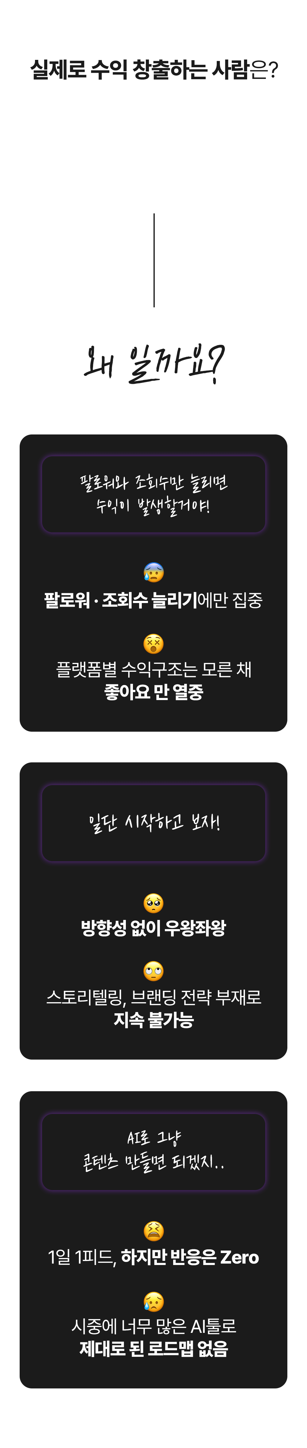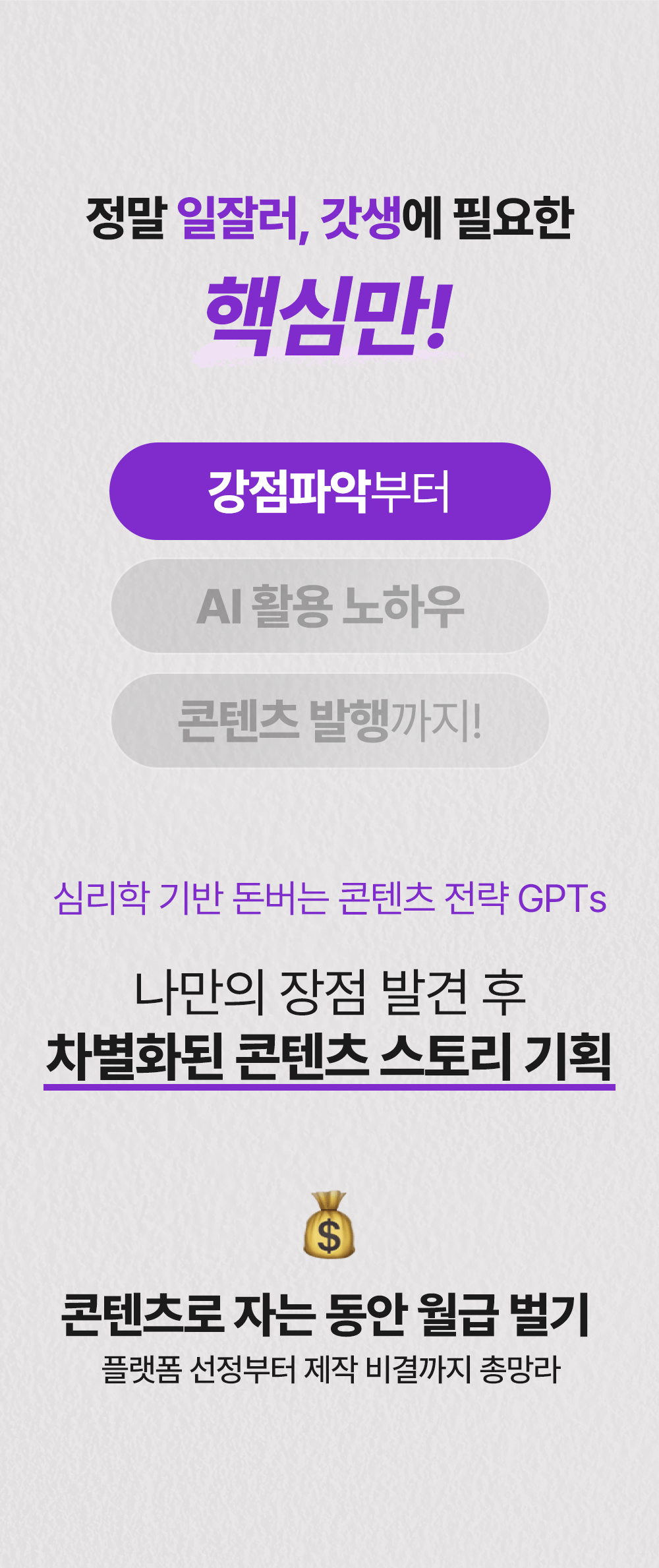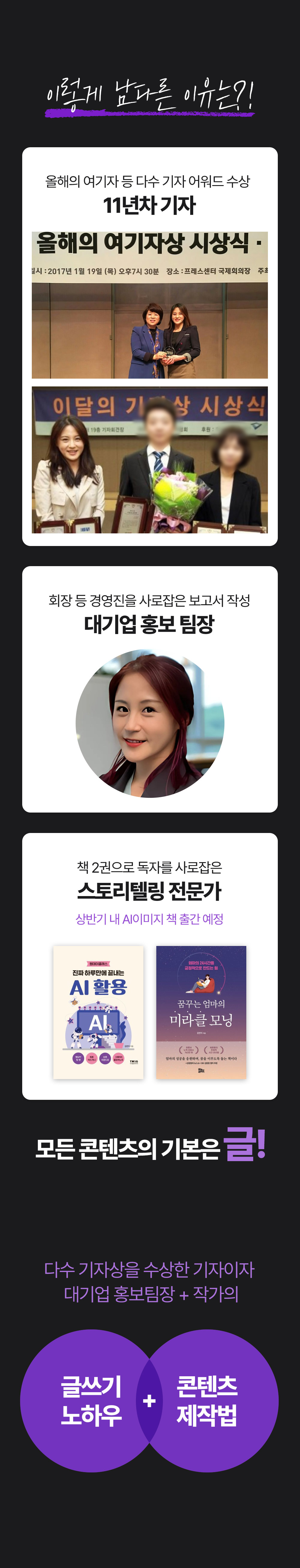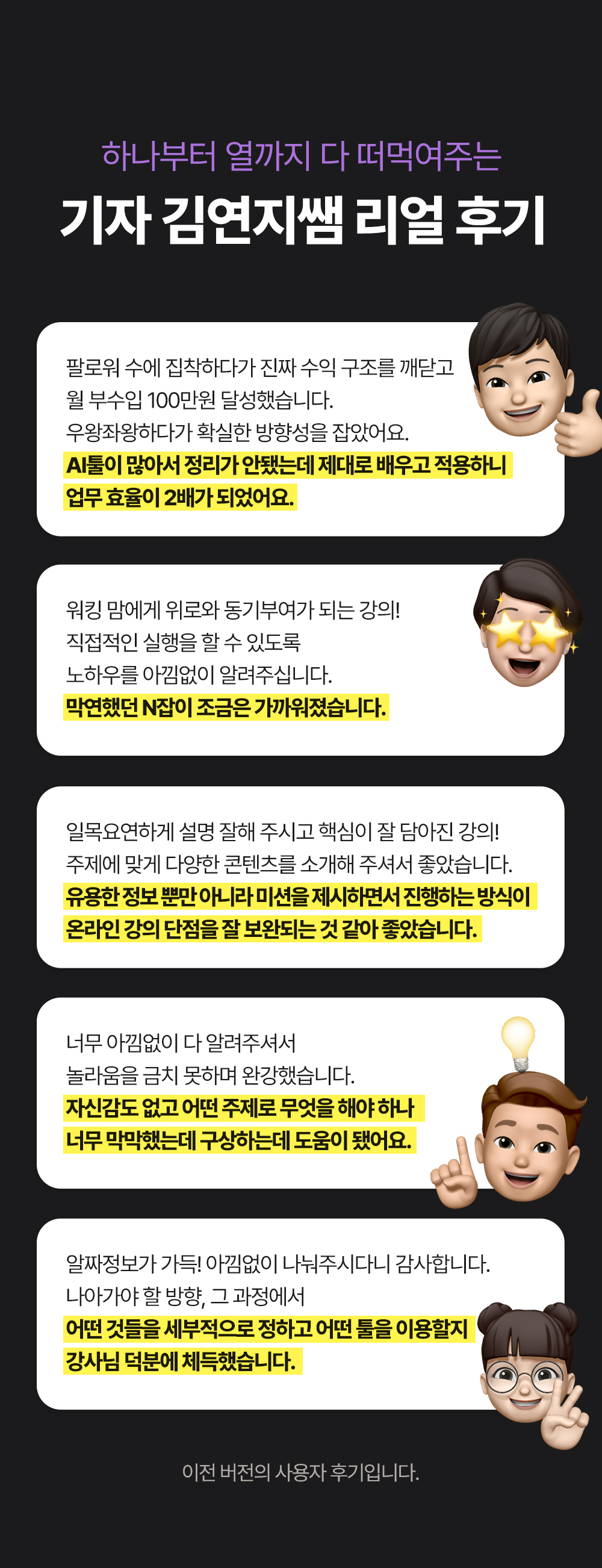 수많은 시행착오와 꾸준히 쌓아올린 시간이 지금의 저를 증명합니다. 커리어를 쌓으면서도, 제 스토리를 콘텐츠로 만든 것이 누군가의 길이 됐습니다. 저를 찾는 사람들이 많아졌고 이는 자연스레 수익 파이프라인이 됐습니다. 월급 외에도 안전 자산을 구축해 오늘도 도전할 수 있는 든든한 원동력이 됩니다.
