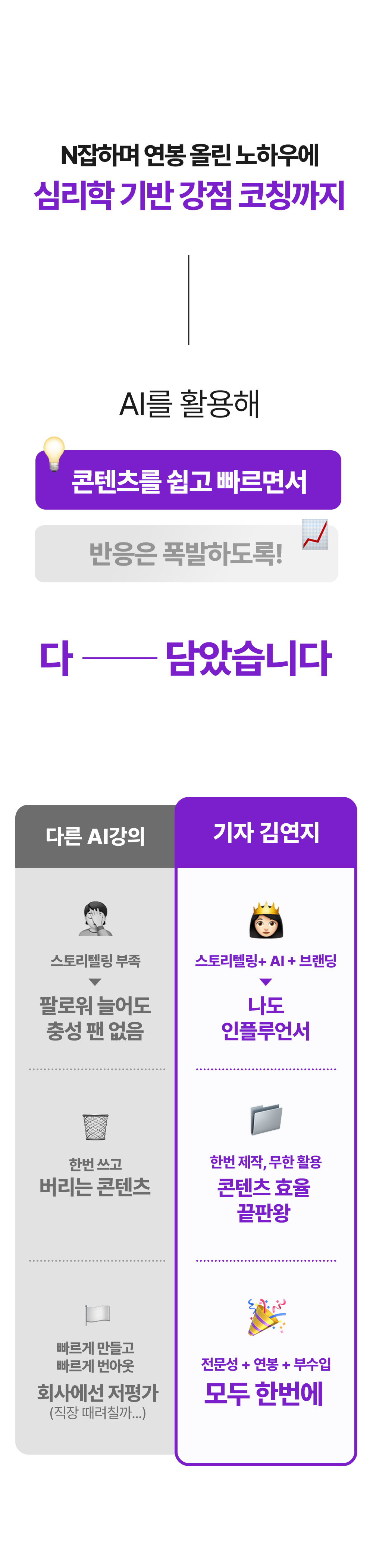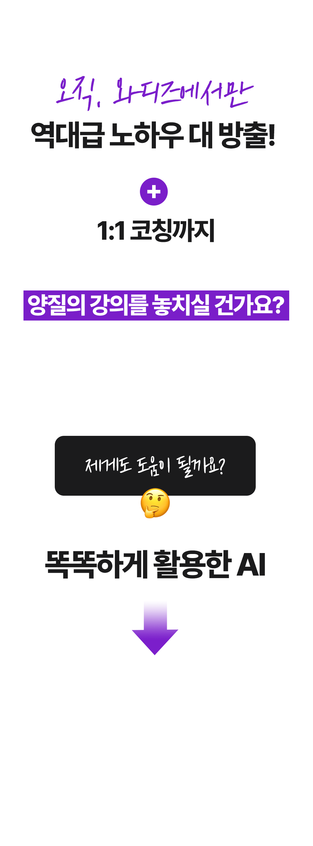 와디즈 메인 유저층은 30~40대 직장인입니다. 움직일 준비가 된 여러분들은 AI 생산성, 콘텐츠, 자기계발 및 루틴까지! 실행력 중심의 제 강의와 꼭 맞는 고객입니다.단순 플랫폼이 아닌 '진짜 필요한 사람'과 관계를 맺는 채널