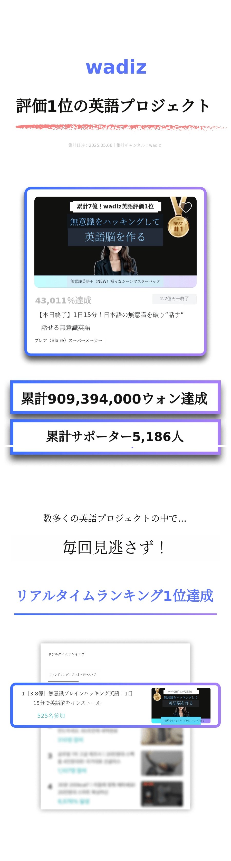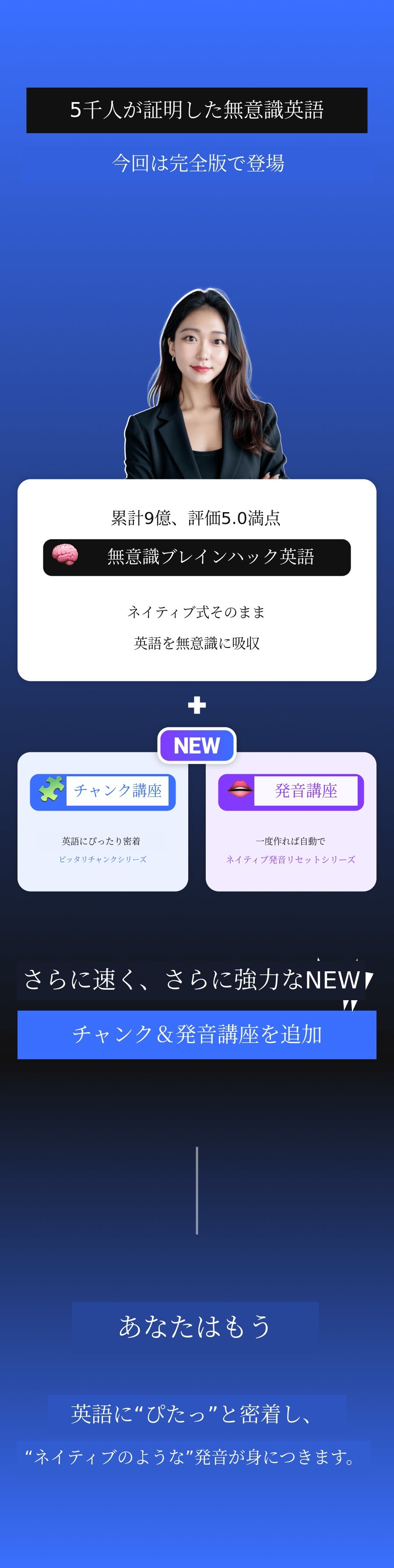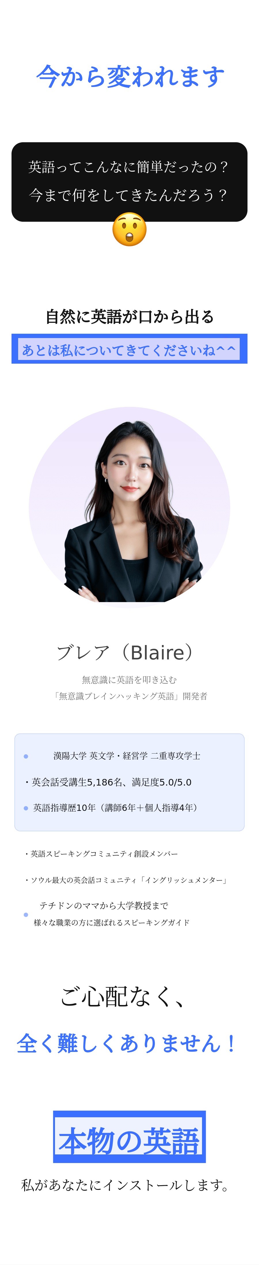 「無意識英語学習法」という革新的な方法を通じて、より多くの人々が英会話の壁を越えて自信を持ち、新しい世界を体験できるようにサポートしたいです。これが私がこのプロジェクトに情熱を注ぐ理由であり、ブレアプロジェクトの核心メッセージです。