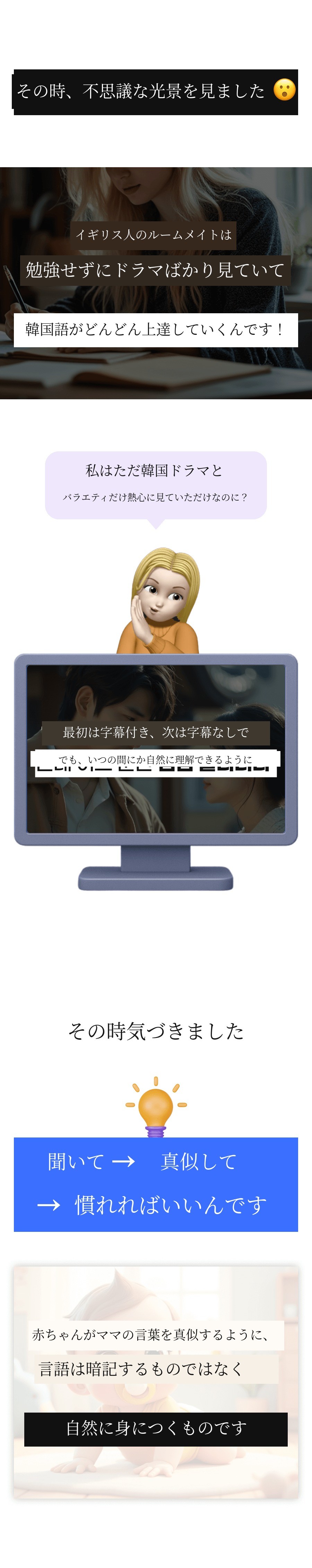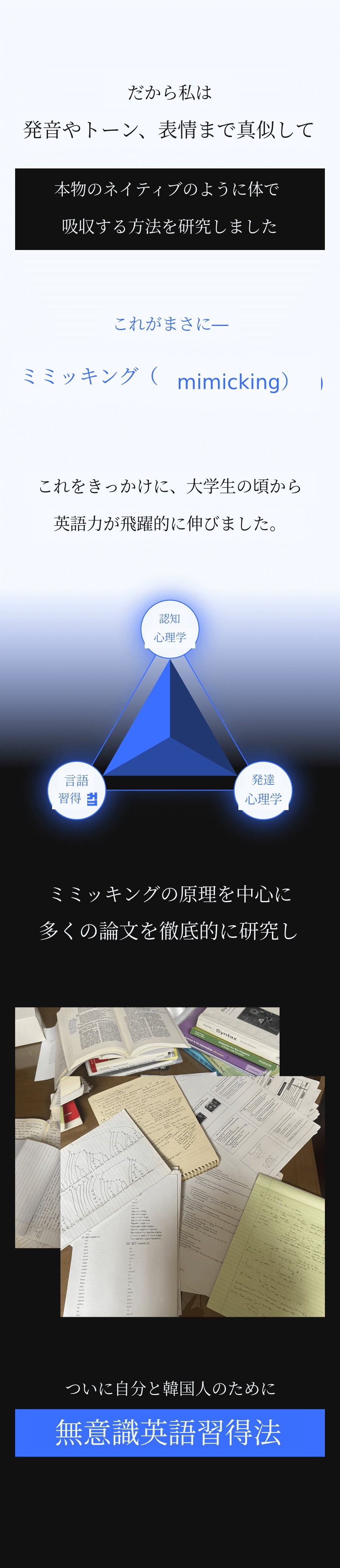 その時から私は韓国のESL学生たちが経験する困難に注目しました。英語を専攻していたので、ESL(English as a second language)学習者がどのように英語を受け入れるのかというメカニズムについては詳しく知っていましたし、発達心理学、認知心理学、教授法など様々な分野の理論を探求し、狂ったように論文、記事、ジャーナルを読み始めました。「ネイティブが英語を学ぶ原理を韓国人にも同じように適用できるのではないか?」と漠然と考えていたことが、研究と検証を経て実現可能に思えました!