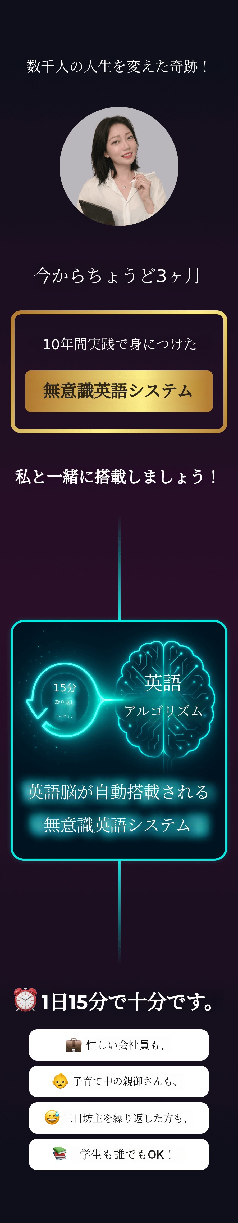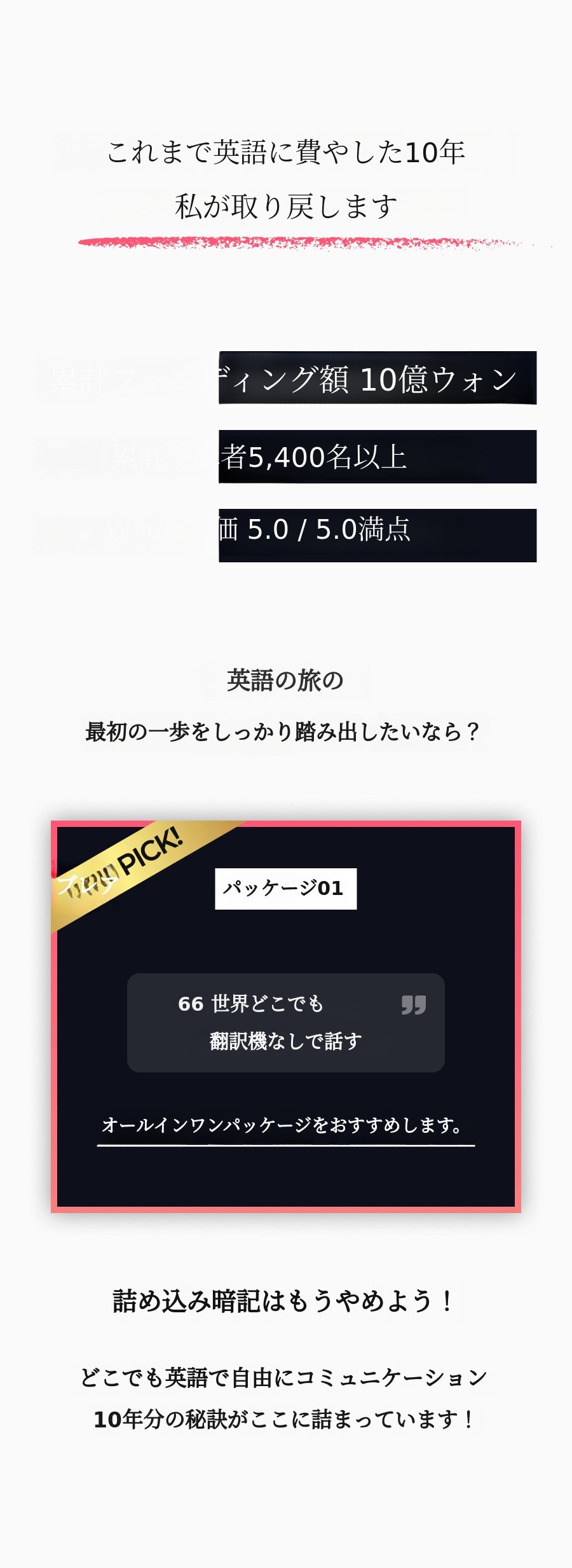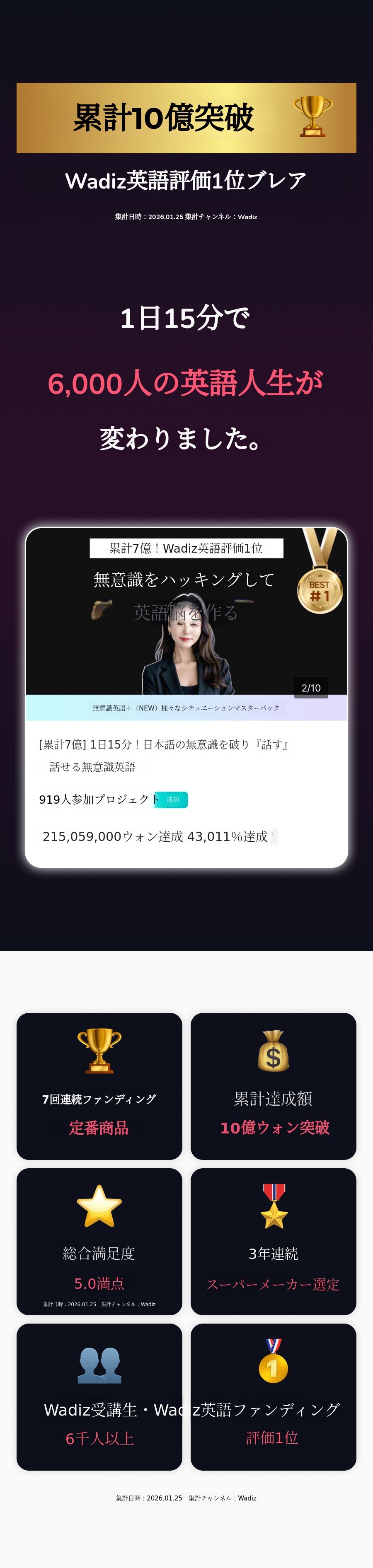 今、私はこの革新的な「無意識英語学習法」をより広い世界に紹介したいと考えています。この本プロジェクトは単に教育コンテンツを販売するものではありません。私の情熱と受講生たちの成功ストーリーを通じて多くの方々に英語学習に対する新たな希望と可能性を提示するプロジェクトです。