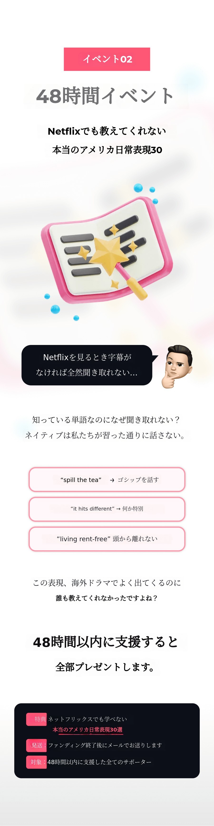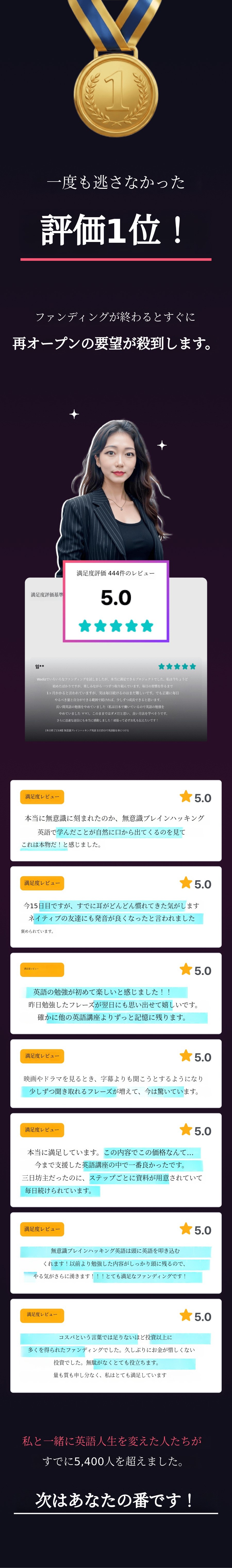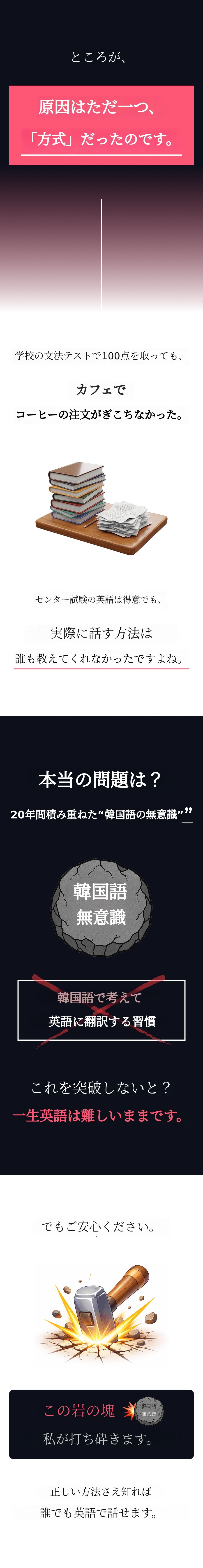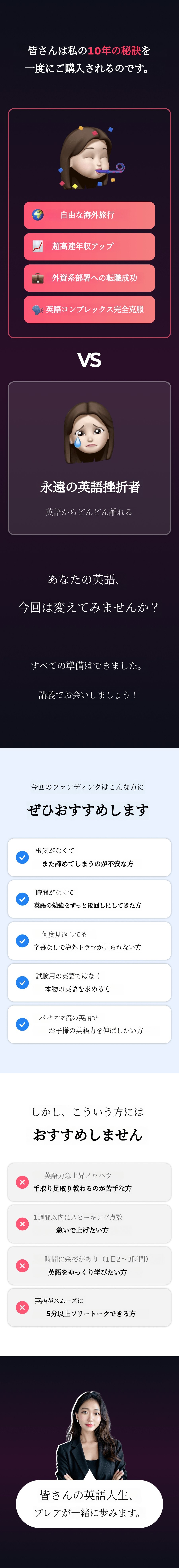今、私はこの革新的な「無意識英語学習法」をより広い世界に紹介したいと考えています。この本プロジェクトは単に教育コンテンツを販売するものではありません。私の情熱と受講生たちの成功ストーリーを通じて多くの方々に英語学習に対する新たな希望と可能性を提示するプロジェクトです。