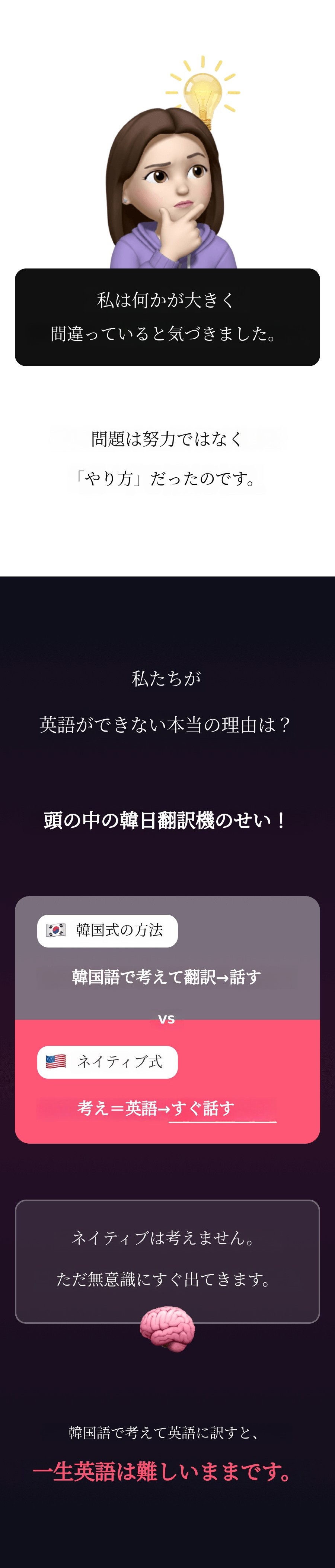 その時から私は韓国のESL学生たちが経験する困難に注目しました。英語を専攻していたので、ESL(第二言語としての英語)学習者がどのように英語を受け入れるかのメカニズムは熟知しており、発達心理学、認知心理学、教授法など様々な分野の理論を探求し、夢中で論文や記事、ジャーナルを読み始めました。『ネイティブが英語を学ぶ原理を韓国人にも同じように適用できるのではないか?』と漠然と考えていたことが、研究と検証を経て実現可能に思えました!