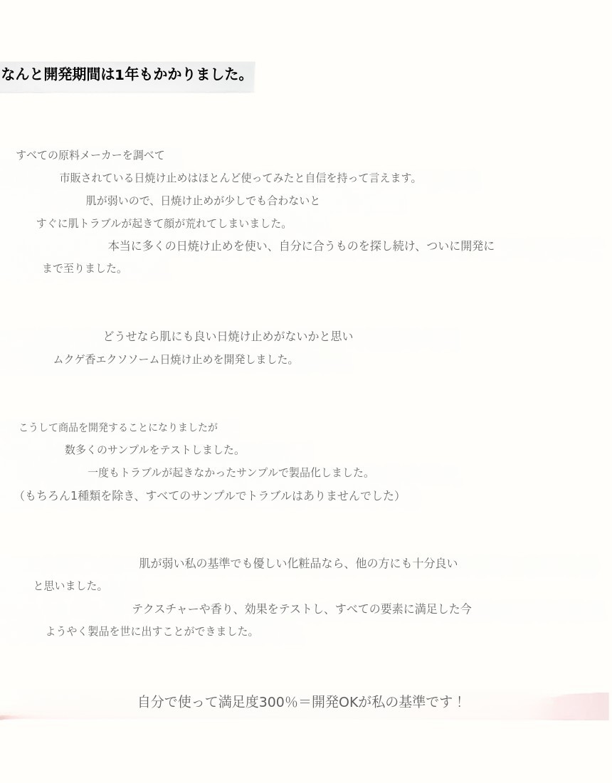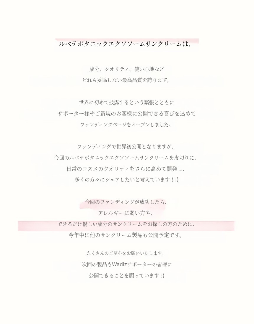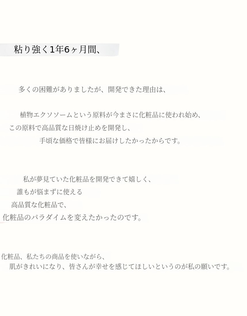シカエクソソーム日焼け止めであるため、機能性化粧品に重点を置き、品質の良い私たちの化粧品であることをワディズサポーターの皆様の良い評価で証明できればさらに良いと考えました。