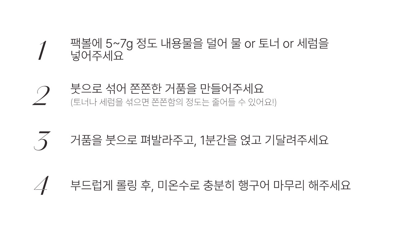 정제수가 없는 파우더 제품이기 때문에 매일 아침,저녁 사용하셔도 한 달 이상 사용 가능합니다.