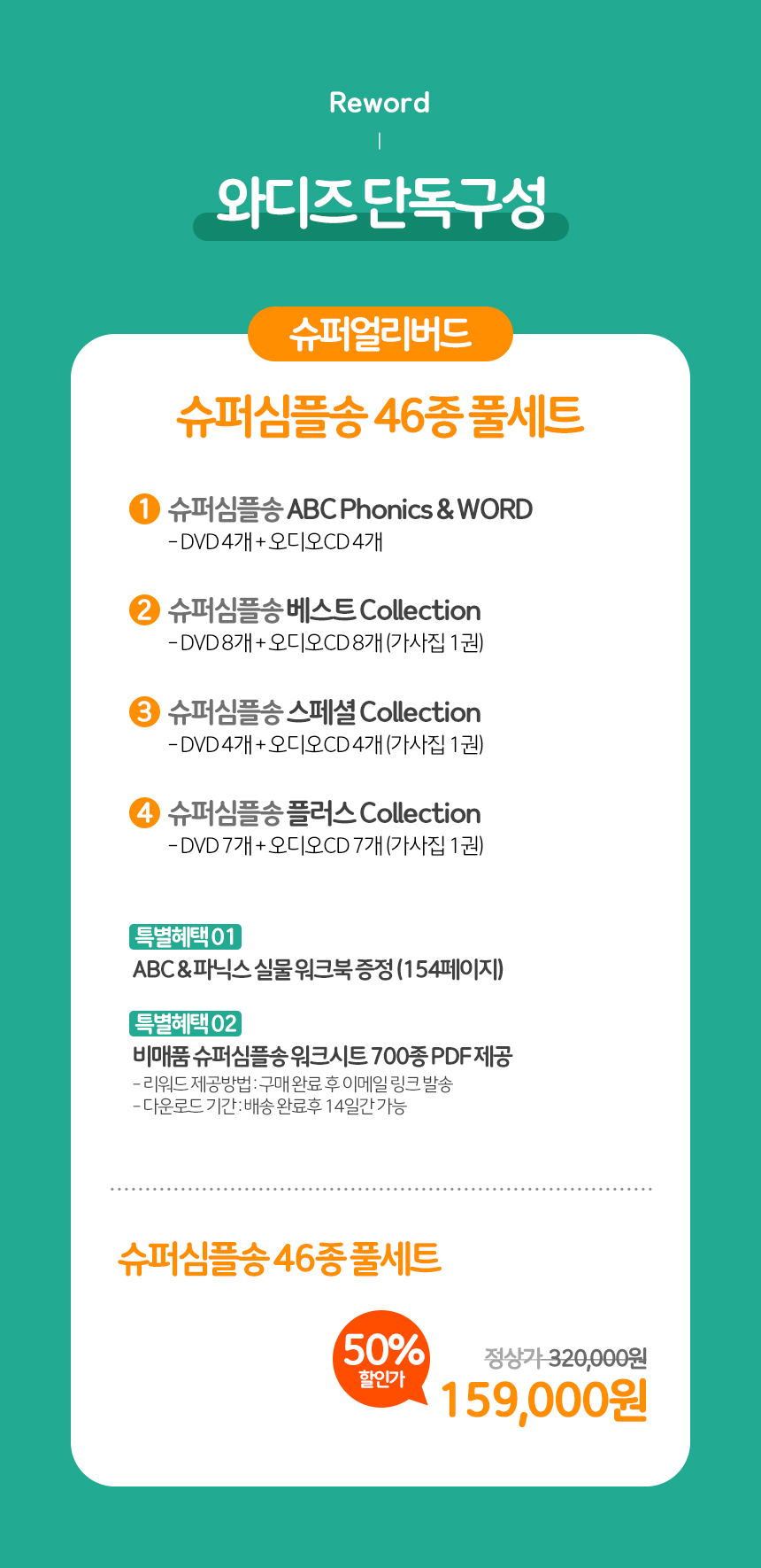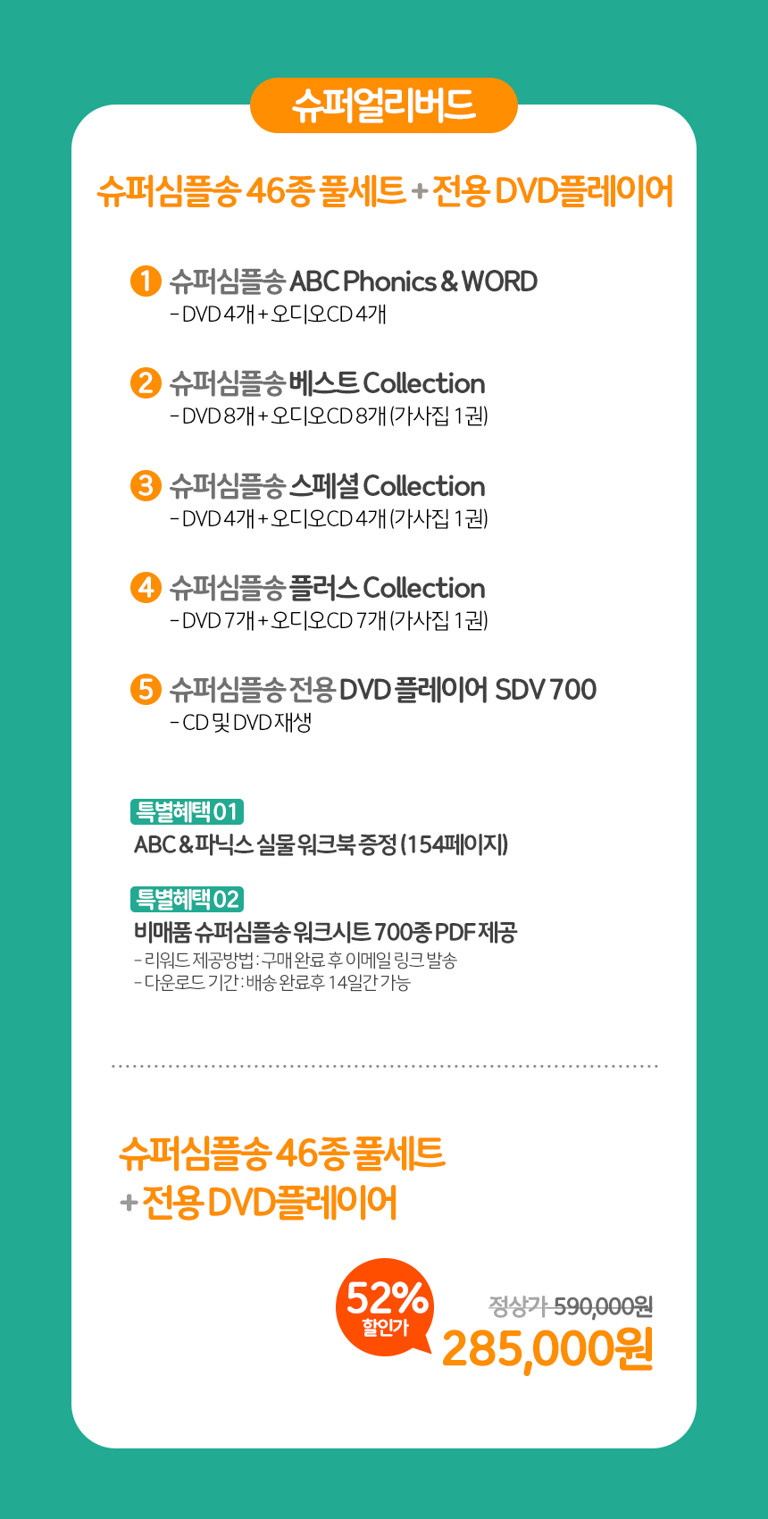 1. 🎵 スーパーシンプルソング英語学習セット - DVD、CD、ワークブックを含む46種のフルセットです 2. 📚 統合学習法と豊富な教材 - 聴覚、視覚、発話を活用し700種のワークシートPDF付きです 3. 💸 ワディズ限定50%割引 - 専用DVDプレーヤー付きでお得に提供します