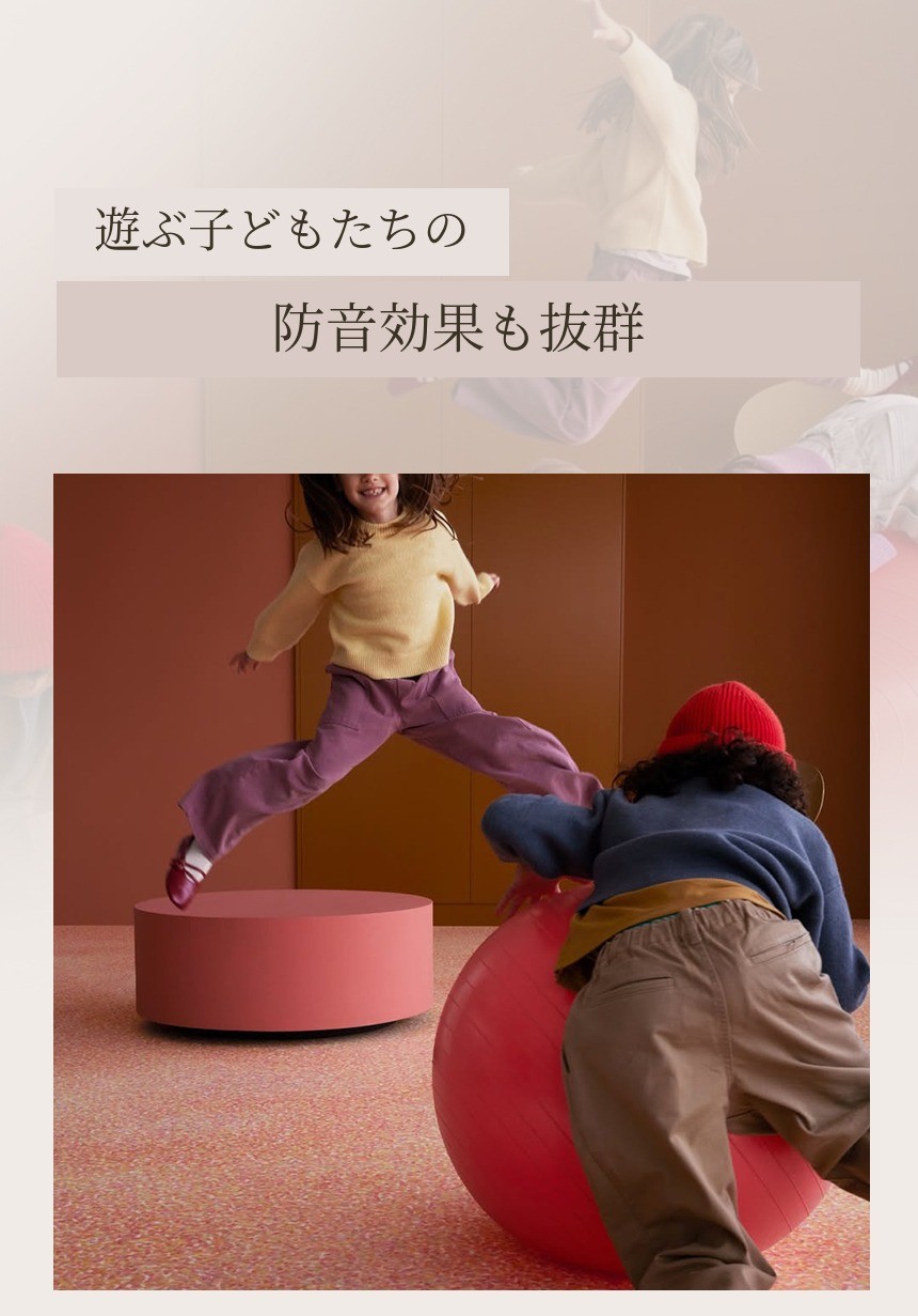 ✔ 子供が走り回ったりペットが動くときに発生する騒音の心配を減らします。(衝撃音低減性能 >20dB)