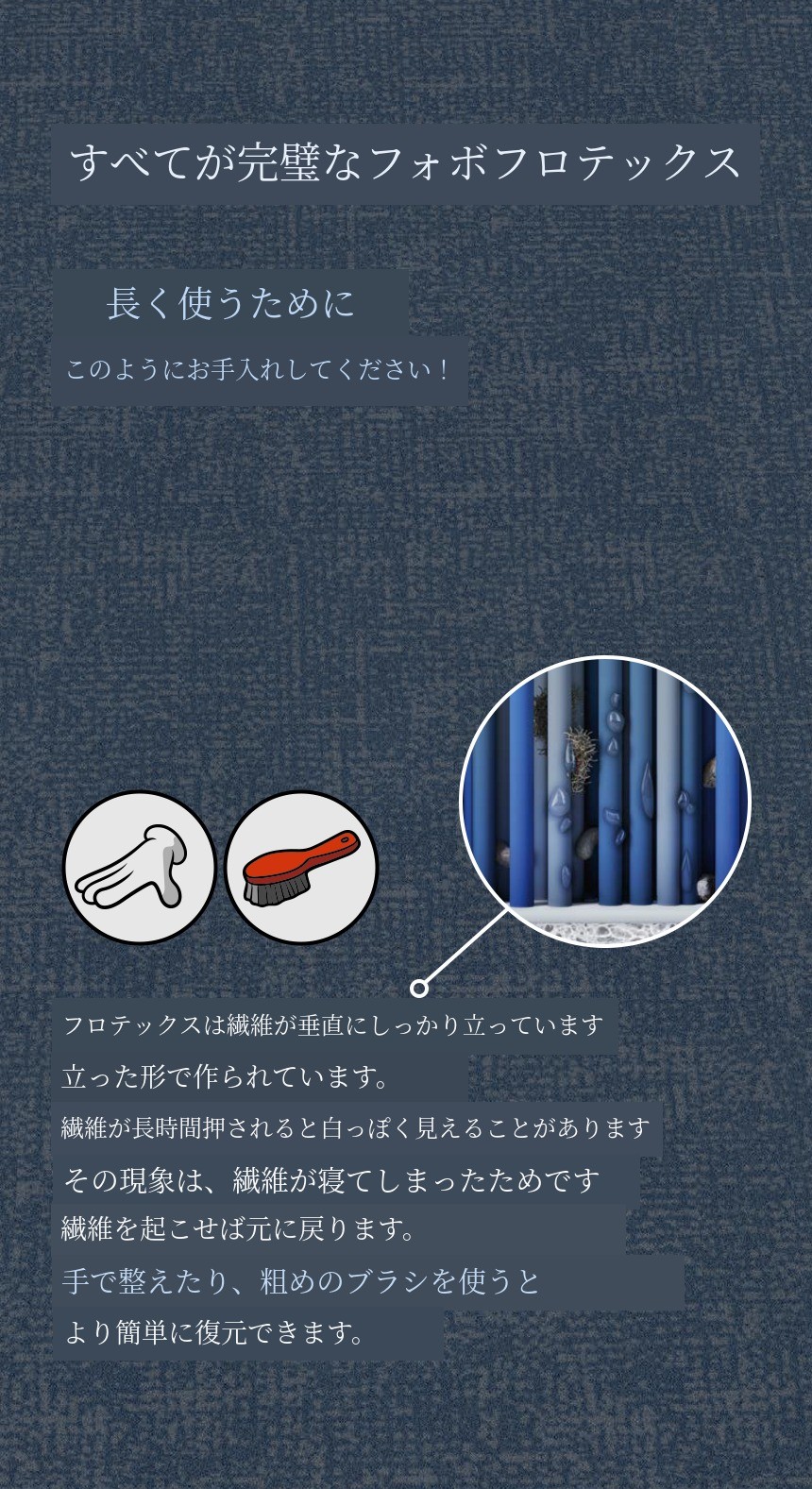 フォボ・フロテックスはイギリス本土で生産・輸入され、その伝統と価値をそのまま伝えます。イギリス現地の技術で一つ一つ丁寧に作られており、より高品質なカーペットタイルを体験できます。
