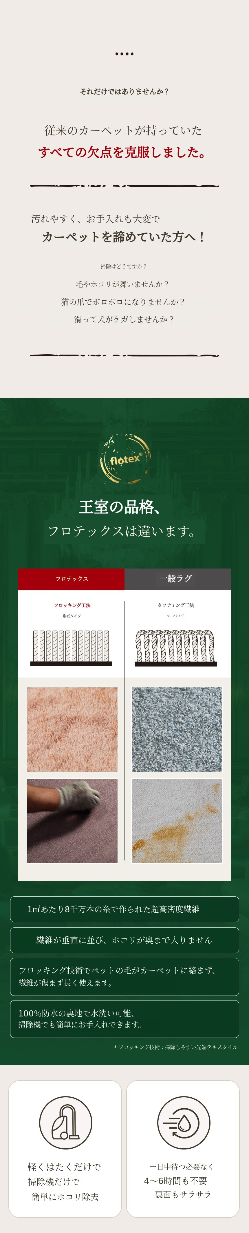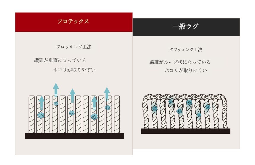 一般的なラグは繊維構造がループ状(ループパイル)になっており、ホコリが繊維の間に入りやすく、掃除をしても完全に取り除くのが難しいという欠点があります。また、使っているうちにすぐ毛玉ができて、きれいな状態を長く保つのが難しいです。フロテックスはこうした欠点をフロッキング(Flocking)工法で改善しました!