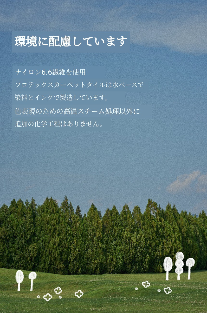 フロテックスは1㎡あたり8千万本の原糸で構成された超高密度繊維構造 を持っています。純粋な原糸の密度を高めた カーペットタイルで最高の品質を実現します。