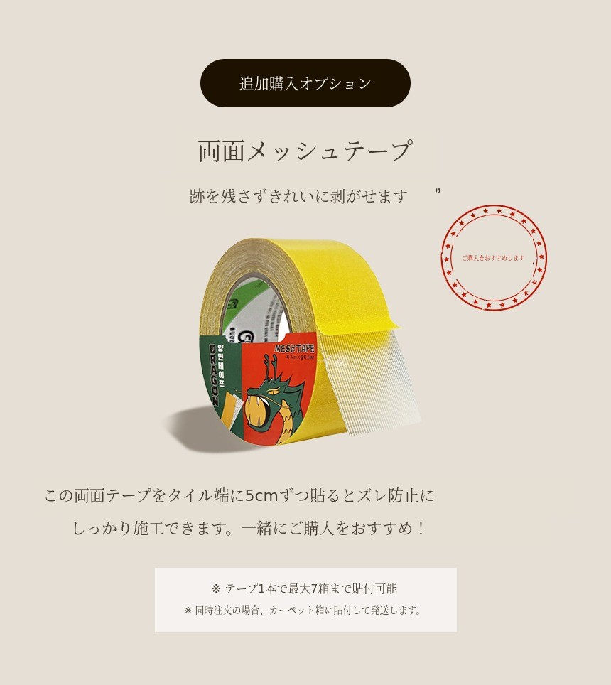よりきれいで安全な施工のために、床とカーペットタイルの間に両面テープを貼って密着力を高めるのが良いです。