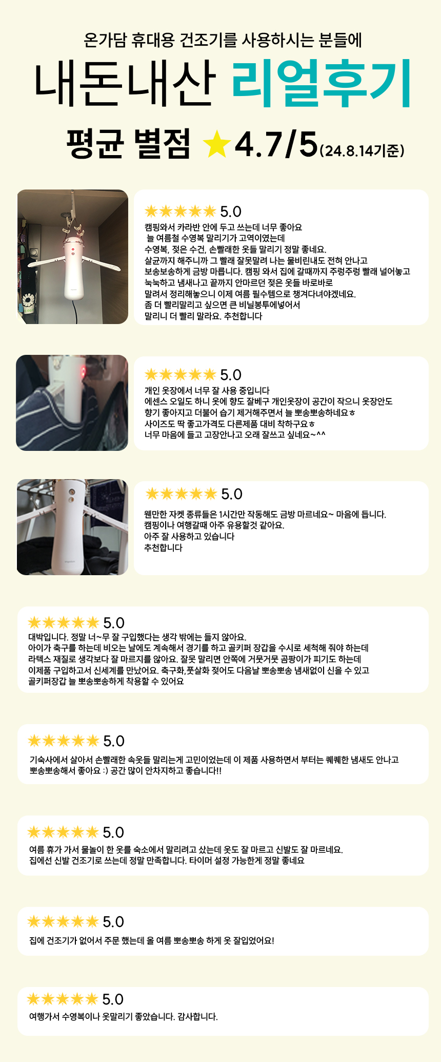 이번 온가담의 휴대용 의류 건조기의 경우, 출장을 가서 문득 떠올랐습니다. 여행지나 출장지에서 빨래 걱정 누구나 한번쯤 해보셨을 거에요. 물놀이나 스키장 등 액티비티한 활동을 하고 젖은 옷을 그대로 가방에 다시 넣어야하는 경우도 많구요 :(