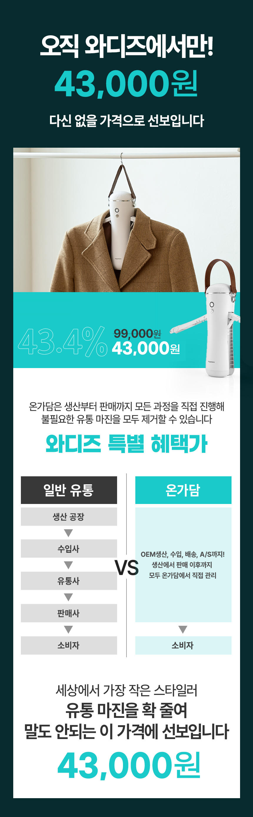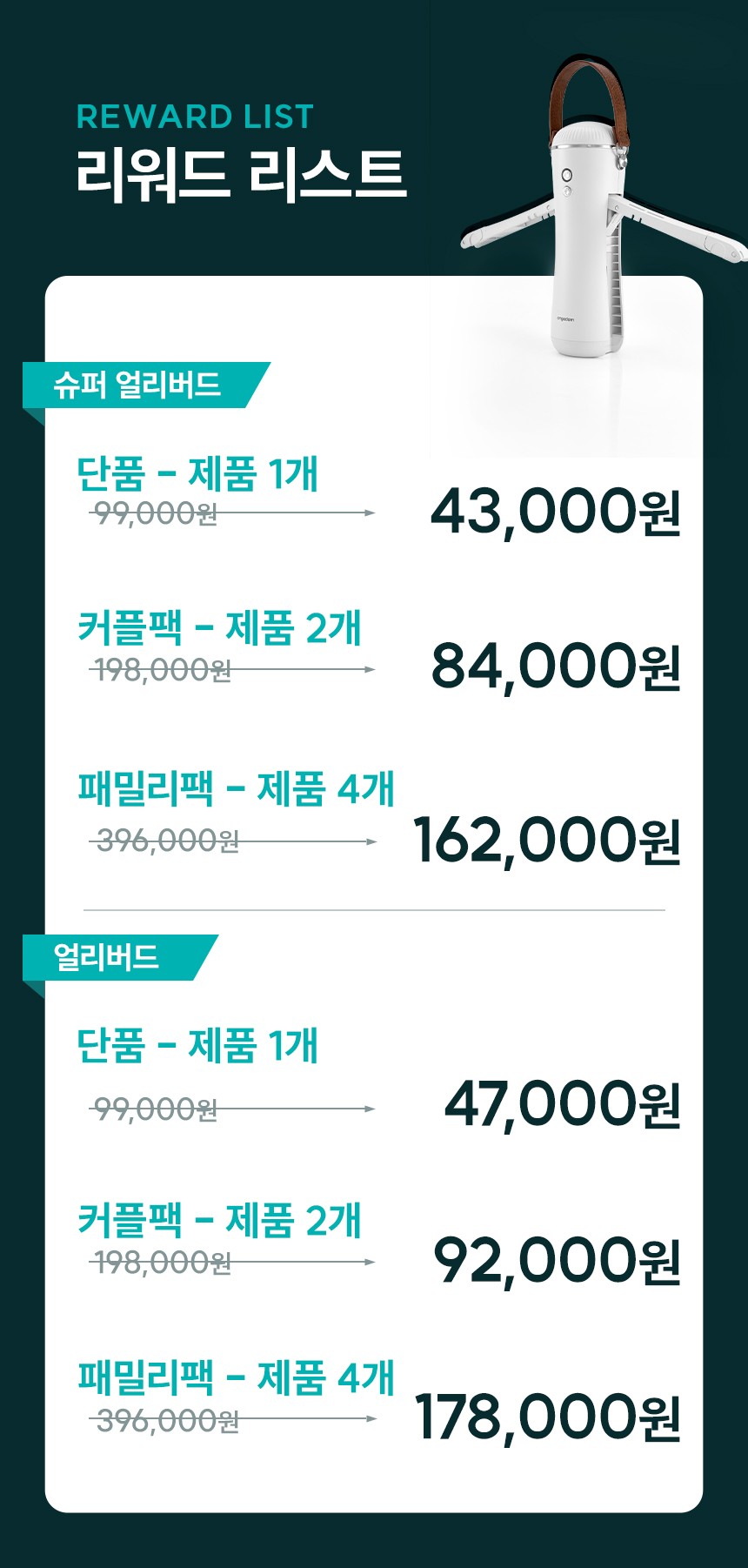 더욱 많은 분들이 온가담의 의류 건조기를 써보셨으면 하는 바람에, 이번 와디즈를 통해 유통 마진을 제거한 합리적인 가격으로 서포터님께 온가담의 제품을 선보입니다. 모금된 금액은 더 좋은 상품개발을 위한 투자, 그리고 서포터님들의 만족도를 높일 수 있는 이벤트 기획 등으로 활용될 예정입니다.