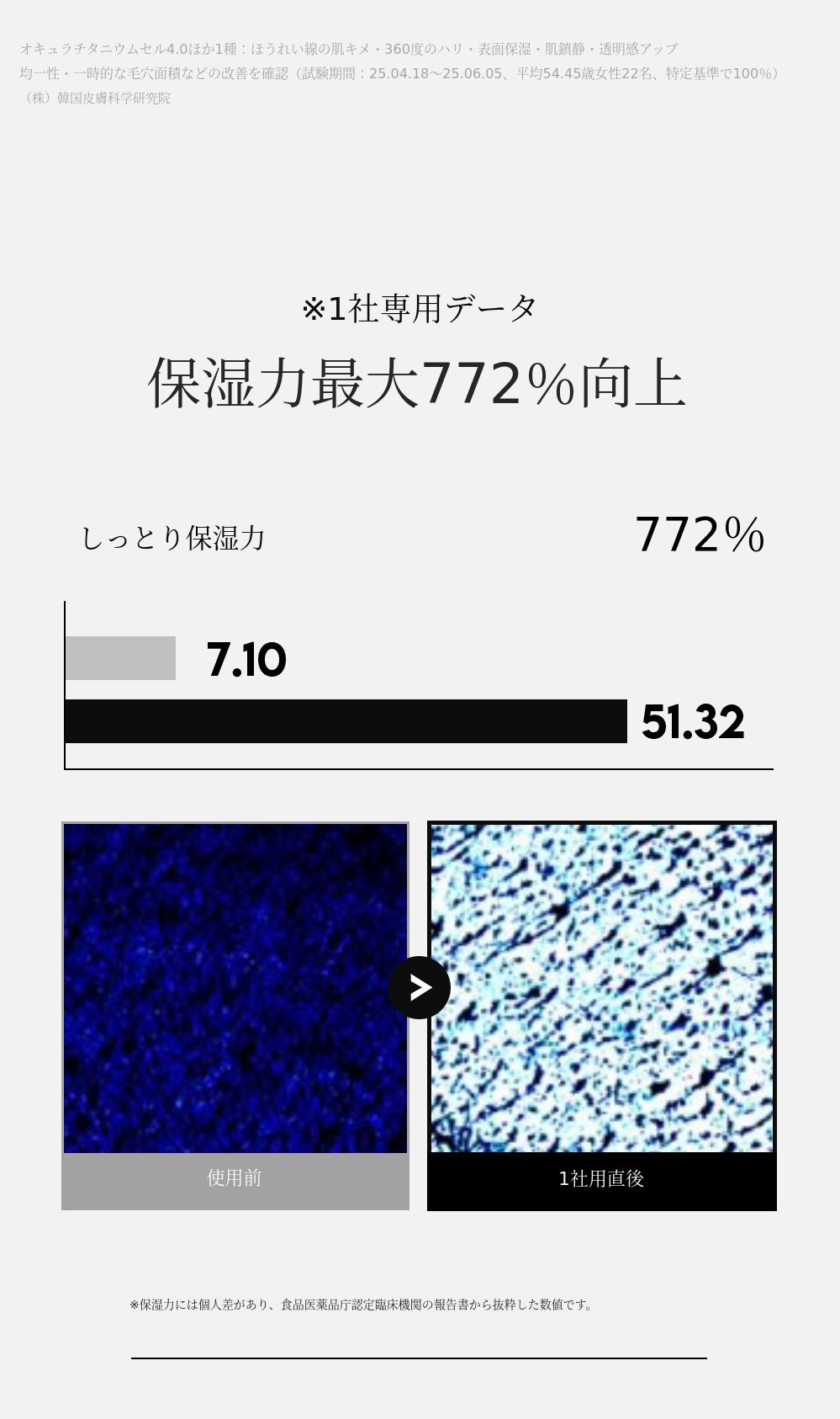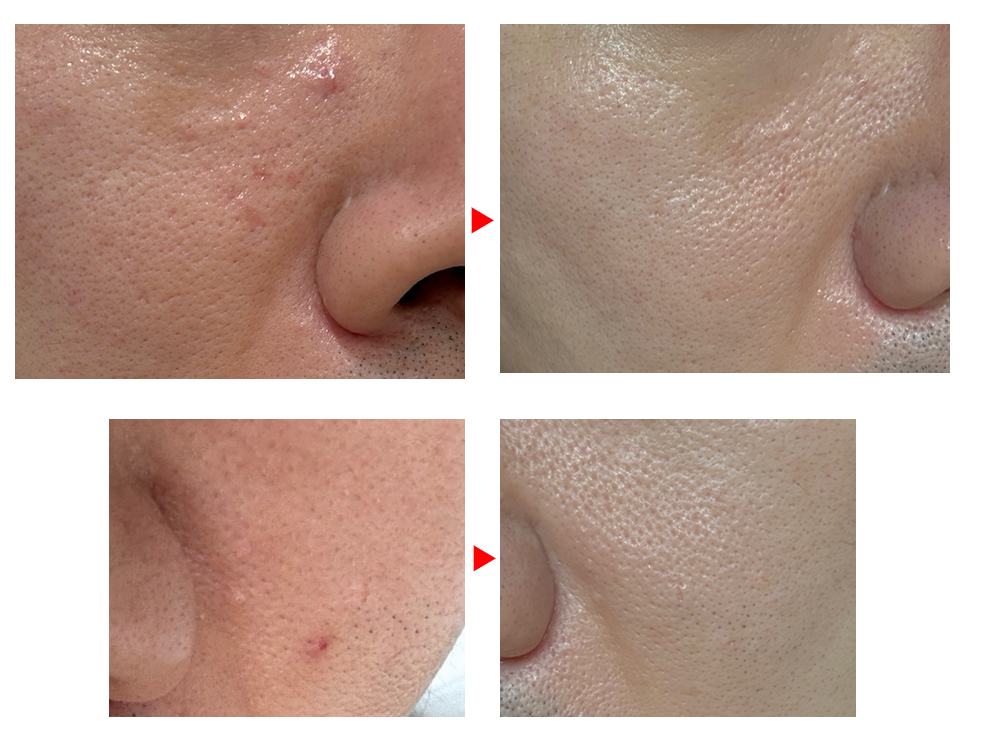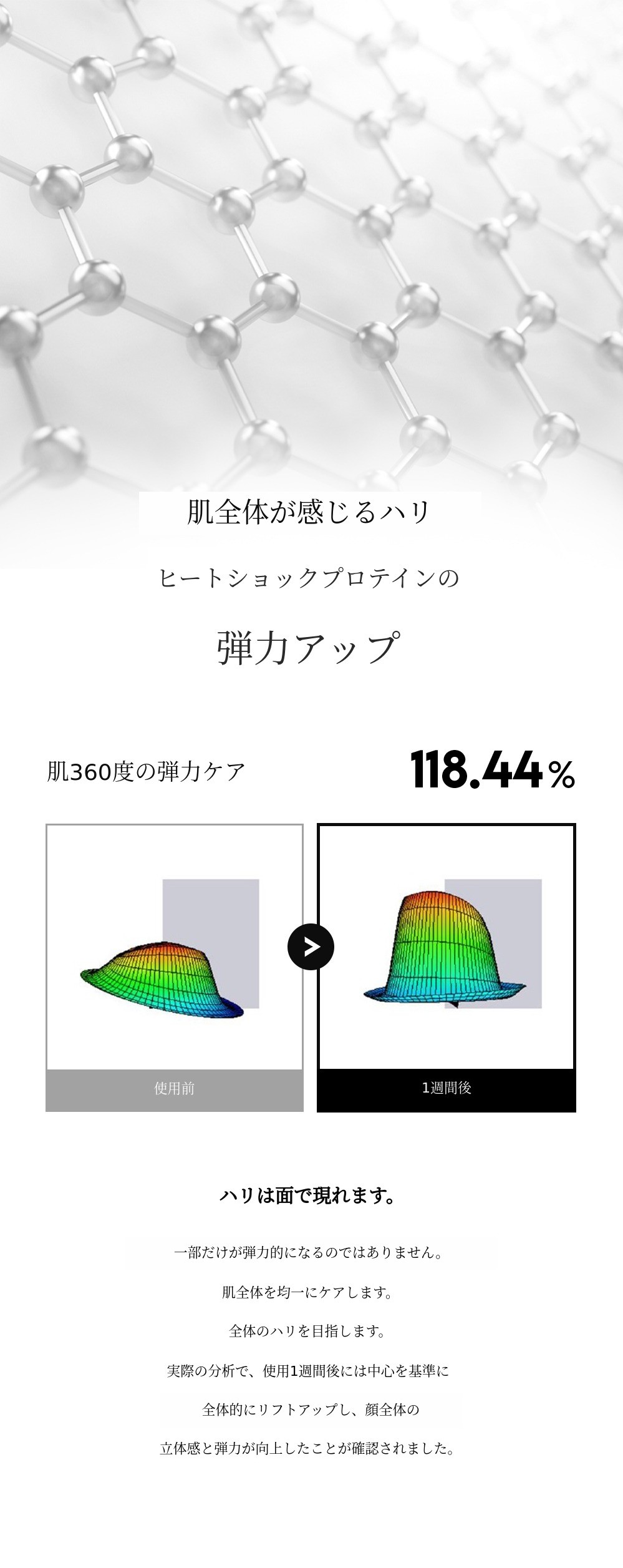 ほうれい線部位の肌キメ、肌のハリ改善、4大毛穴改善効果が食品医薬品安全処登録臨床機関で証明された技術です。