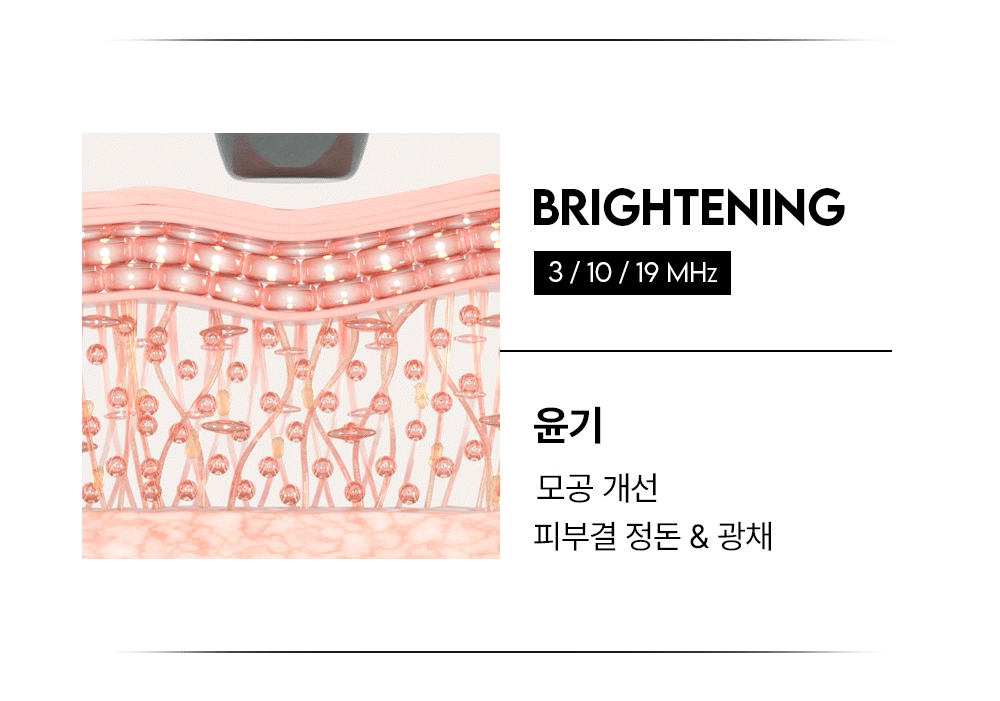 19MHzは高周波帯で、主に真皮上部に到達し、繊細な刺激と真皮層の活性化を誘導するのに適した周波数です。